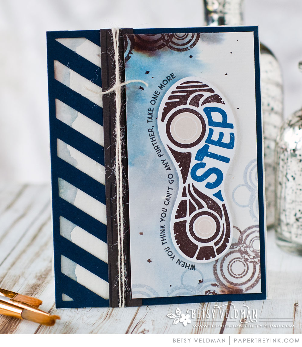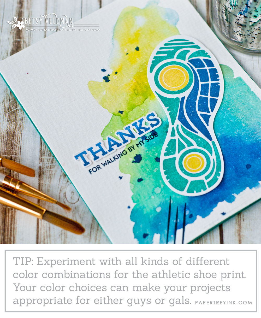 My first project uses the super cool athletic sneaker sole. I think one of the things stampers find most challenging about masculine projects is that that masculine based images seldom offer many options for color play. Since most card design starts with color, this can serve as a road block. But with this particular multi-step image in Heart & Sole, you can play with color to your heart's content, just like you would with floral images.