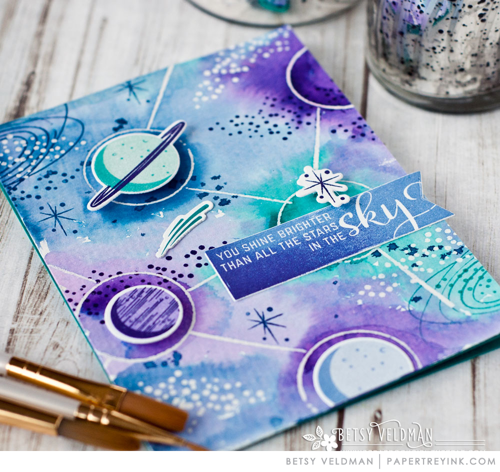 The new Background Basics: Celestial Sky makes it SO easy to create amazing detailed backgrounds that look like they took lots of time to create. I heat embossed it in black, then went back in with a gold paint pen to add a few more details around the moon.