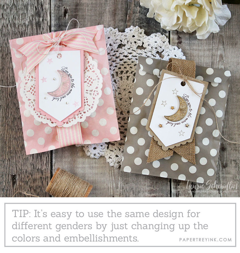 This sentiment is meaningful for so many people and Laurie has showcased it beautifully with these layered tags. Not only do the colors define gender, but the accents do as well, with gemstones for the feminine pink version and wooden stars for the masculine.