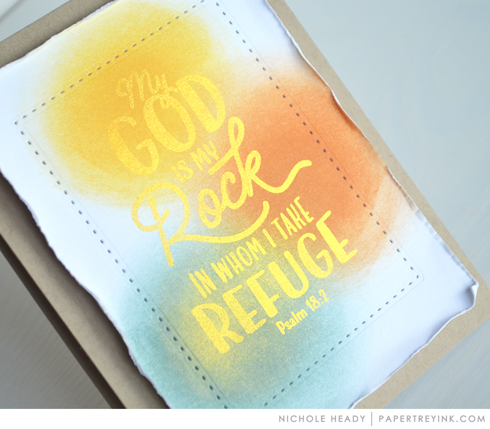 The sparkly embossing used on the sentiment is a real attention grabber and helps keep the focus on the verse rather than the other elements. The colors are just spot on and so beautiful. Melissa is always fantastic about all the little details!