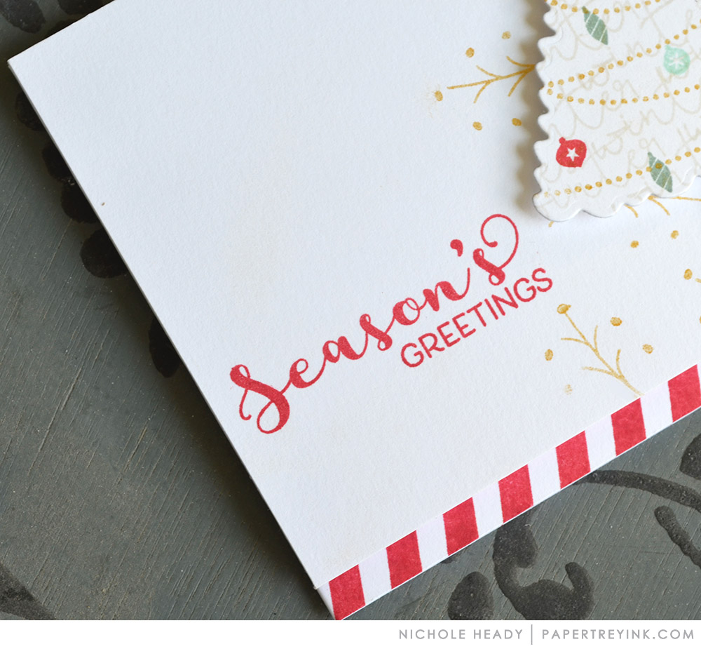By adding little touches of gold, I was able to achieve a festive look. Note the three touches of gold to create a visual triangle between the sentiment, sequin and gold glitter strip.