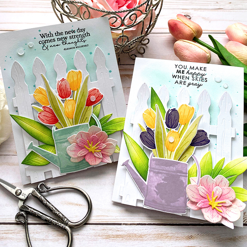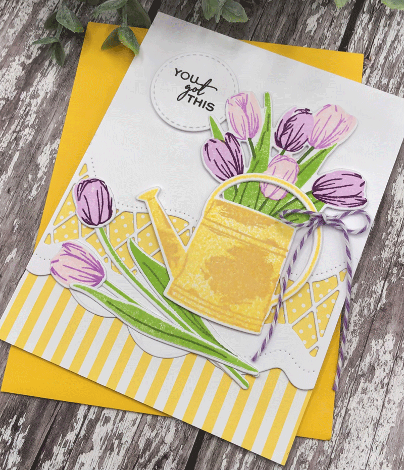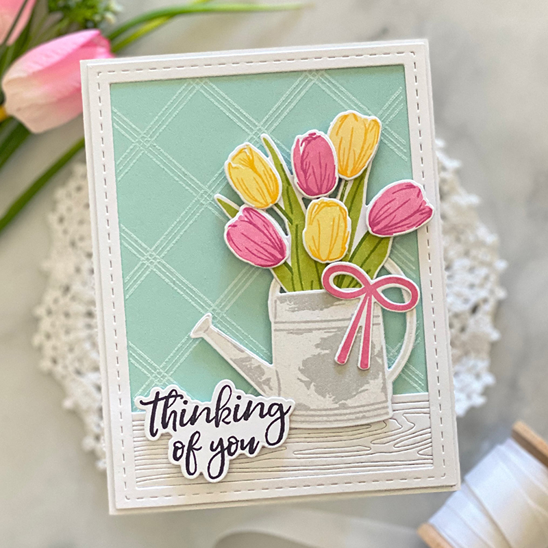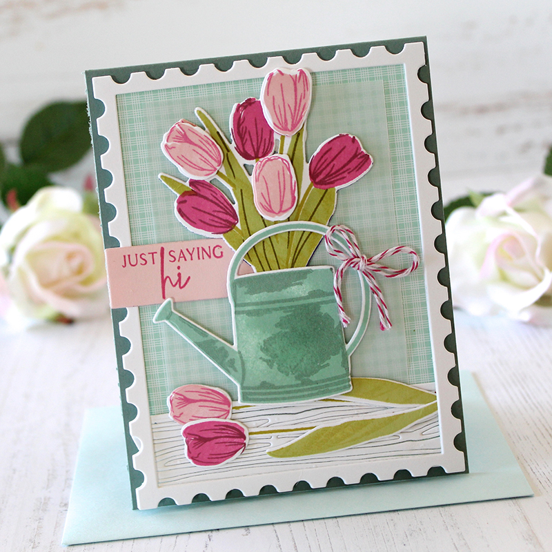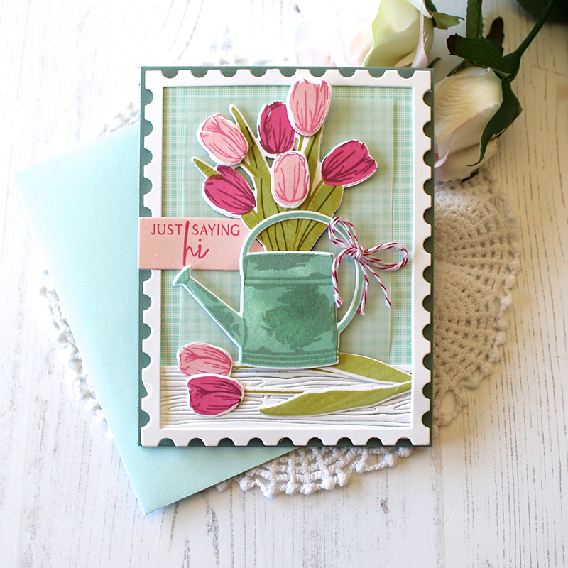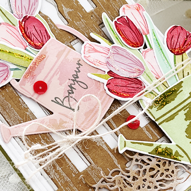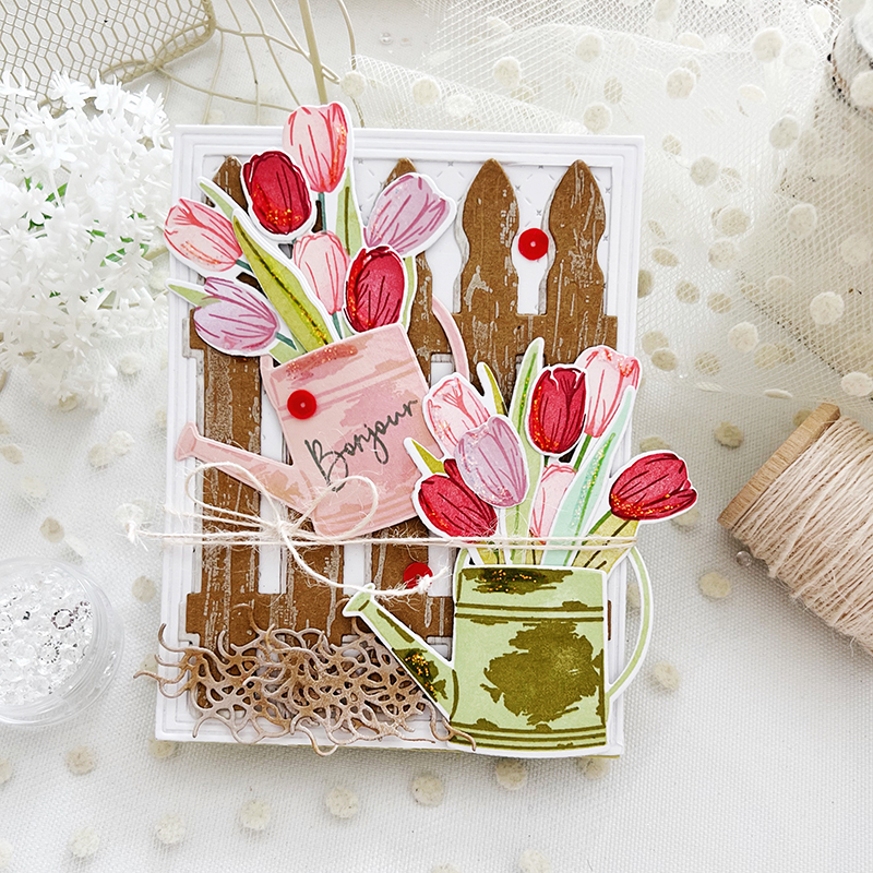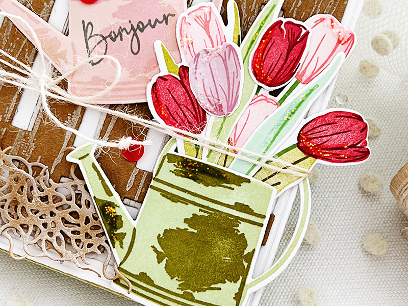 I used the Picket Fence die behind my tulips, knowing beforehand just how much I wanted to hang my watering can on a shabby, weathered, picket fence. After cutting my fence from Kraft Cardstock, I used the Weathered Wood Background stamp and Fresh Snow ink to add a bit of texture.