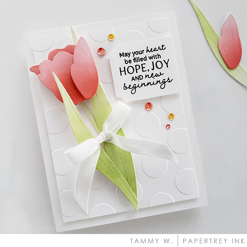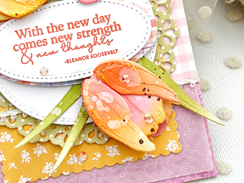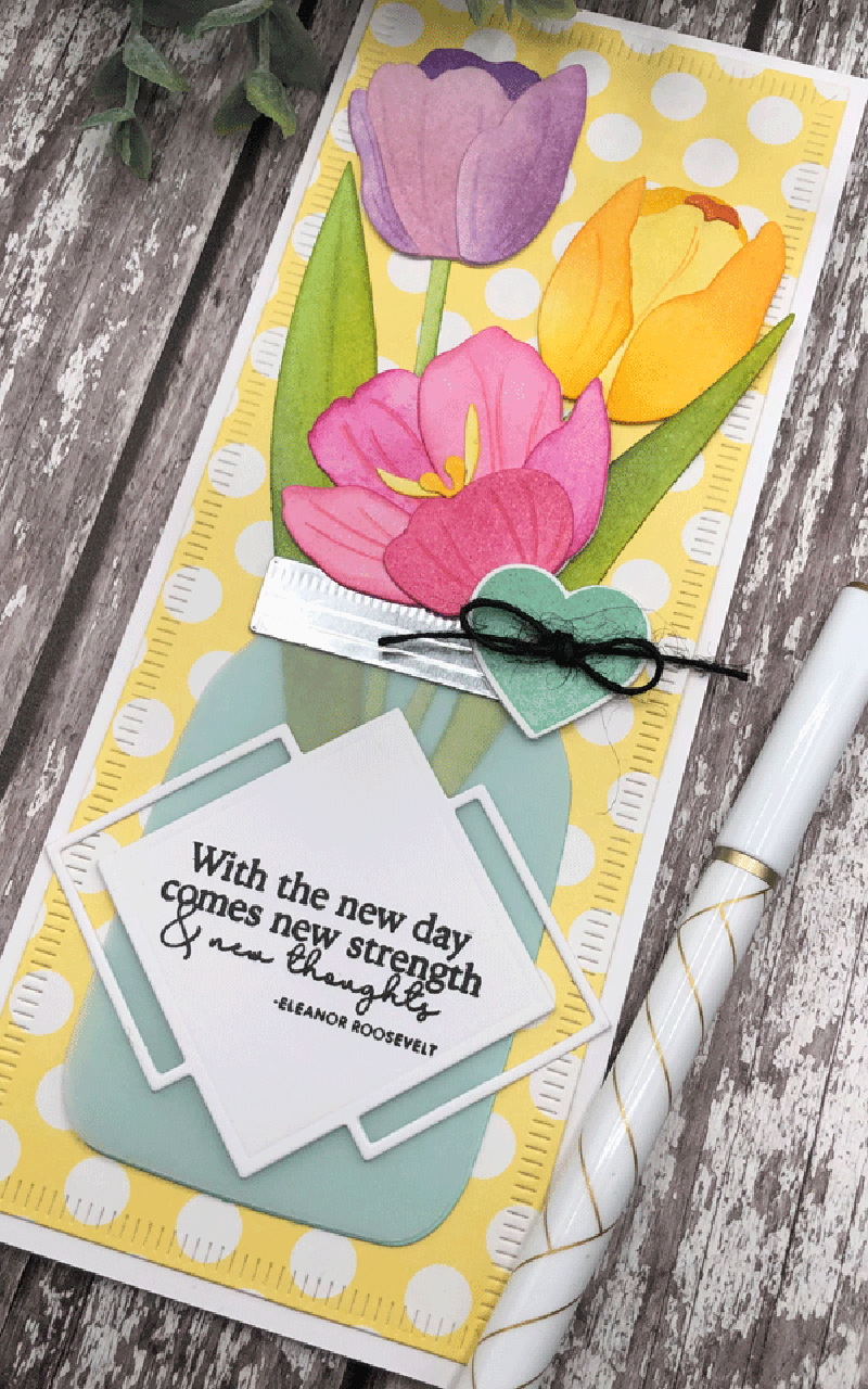 This die set also comes with lovely, large tulip leaves and stems so you can use them in a variety of ways, such as coming right up from the earth, or trimmed to fit around a sentiment such as I’ve done with mine. I snipped my leaves so they’d fill in behind my tulips and help accentuate my sentiment.