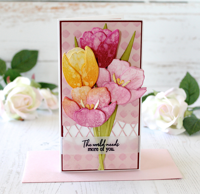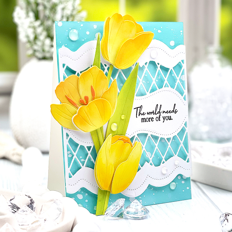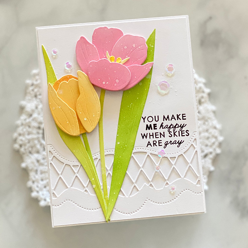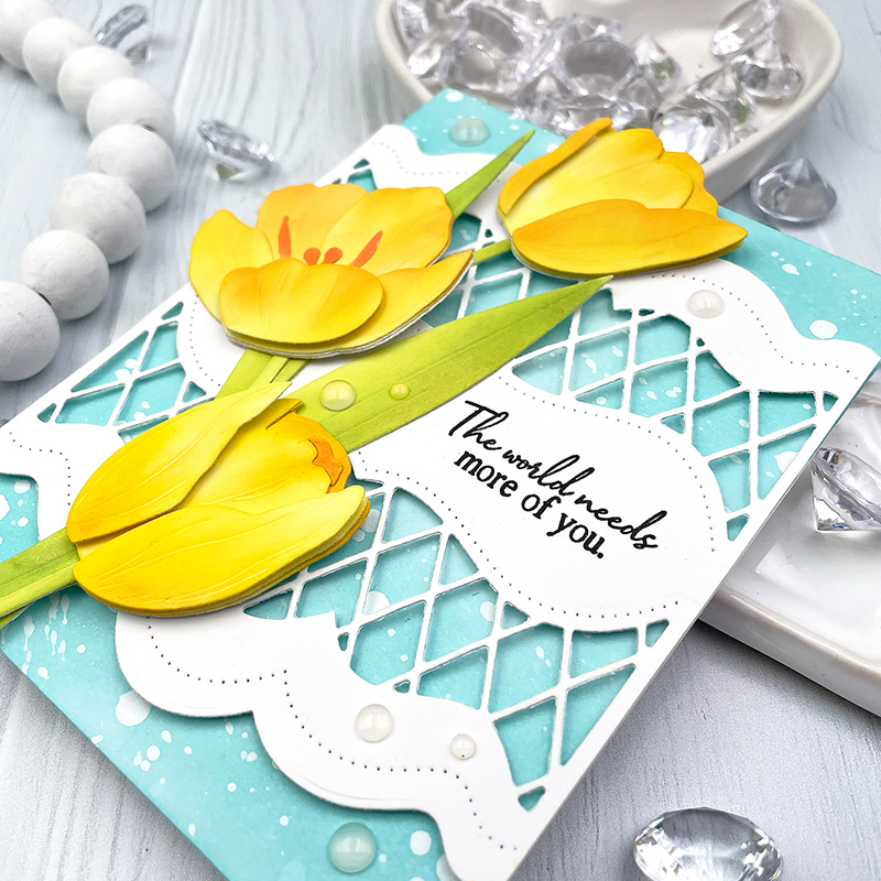 Introducing the new Into the Blooms: Tulips die collection. Tulips are my favorite flower, ever! I used yellow tulips at my wedding and so they always remind me of that special day. This die collection comes with three different tulips, complete with layering pieces to really bring out the depth, dimension, and life of each.