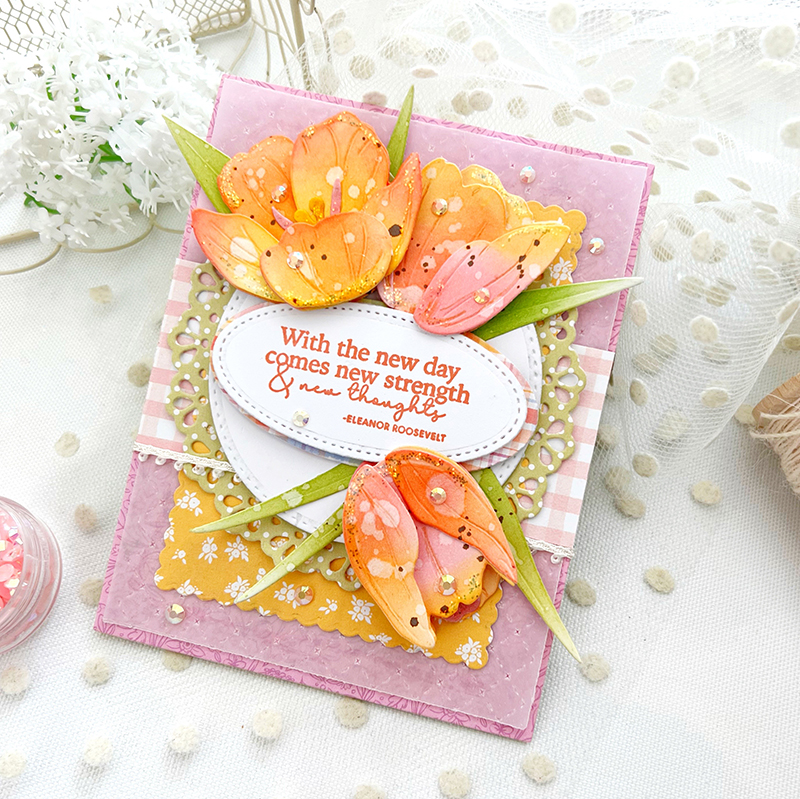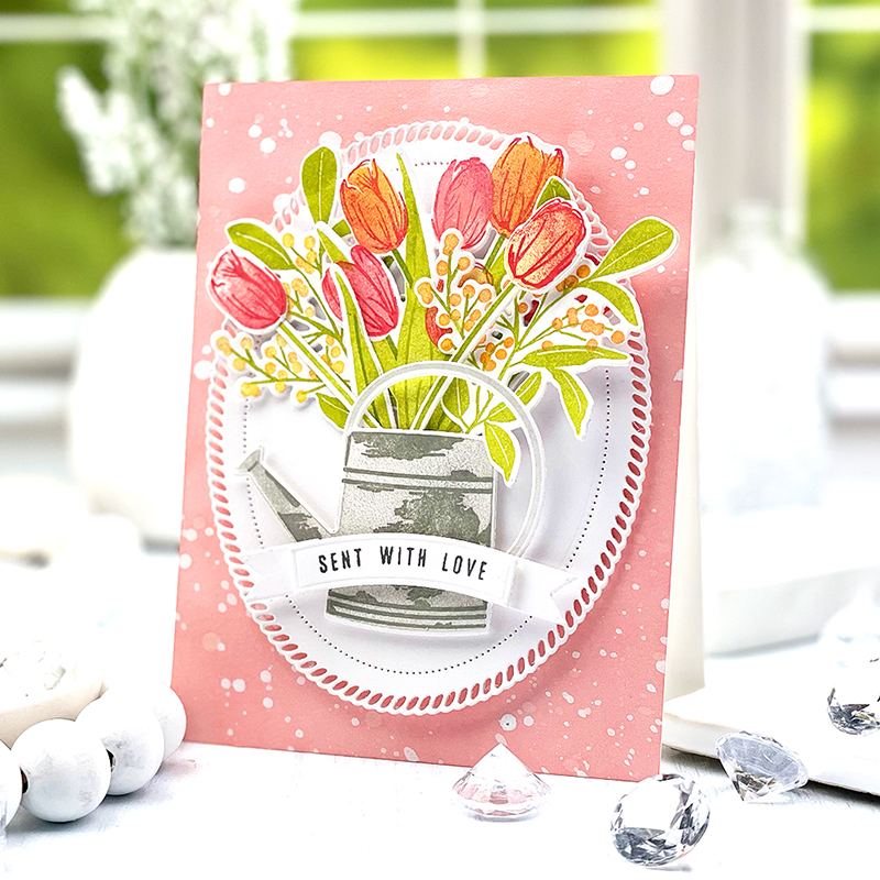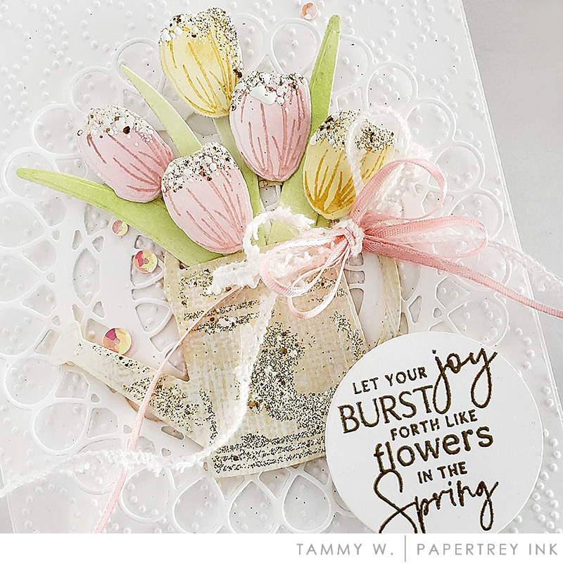 This gorgeous card created by our designer JJ Bolton, uses the new Into the Blooms: Tulips dies combined with our amazing, new Elegant Edges: Lace dies. Aren’t these new dies just everything you could wish for when adding extra detail, layering, and pattern?