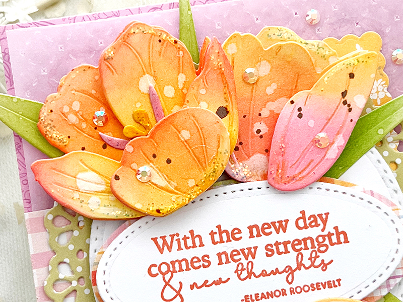 I can’t begin to tell you how beautiful these are! You’ll just have to see them in real life and watch them bloom as you assemble them. I die cut mine from Stamper’s Select White and then sponged ink color on in Lovely Lady, Berry Sorbet, Summer Sunrise, and Melon Berry over my surfaces. I then spritzed each petal with a bit of water and let dry before assembling. My sentiment is from the delightful, new Just Sentiments: Quotes stamp set. This wonderful mini set comes with a variety of quotes, perfect for many different occasions.