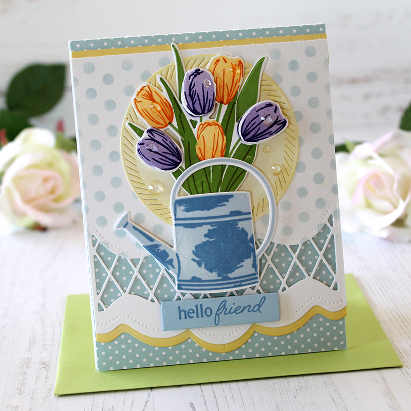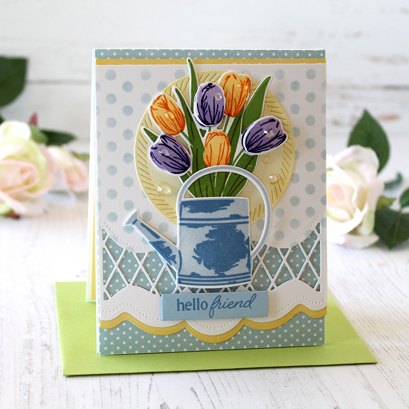 - Add vellum behind the watering can tulips to soften the background pattern
