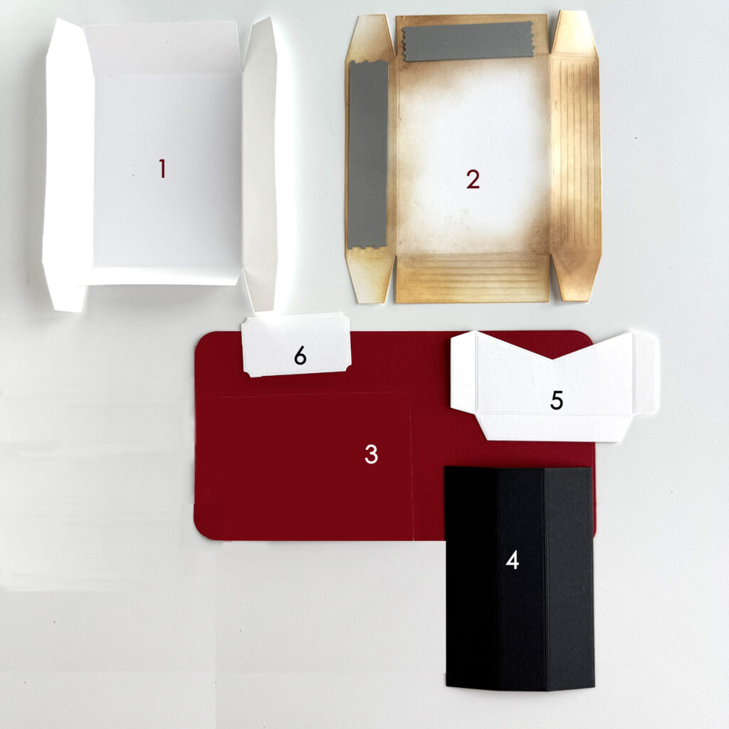 (5 & 6 above ) Die cut the interior pocket and the label from Stamper’s Select White cardstock using the dies from Go-To Gift Card Holder: Book Pockets die and Go-To Gift Card Holder: Book die, respectively.