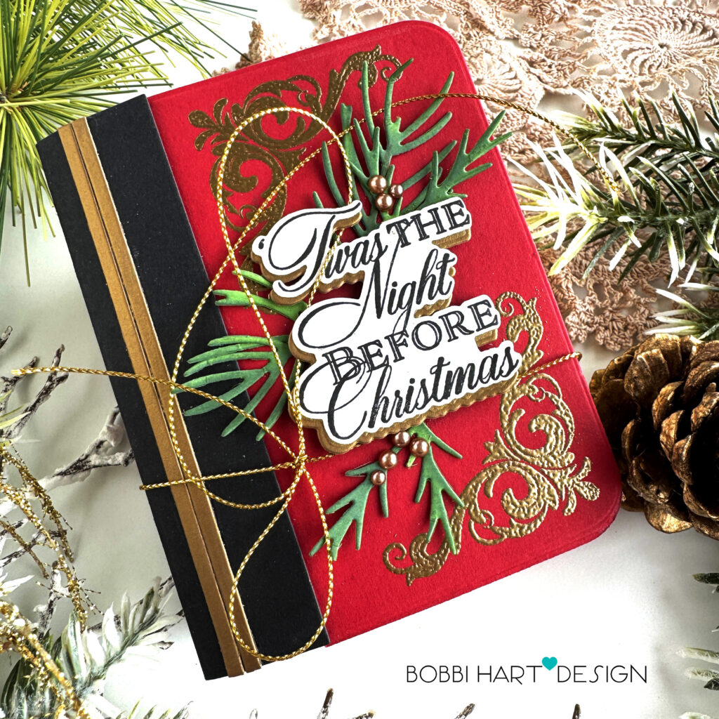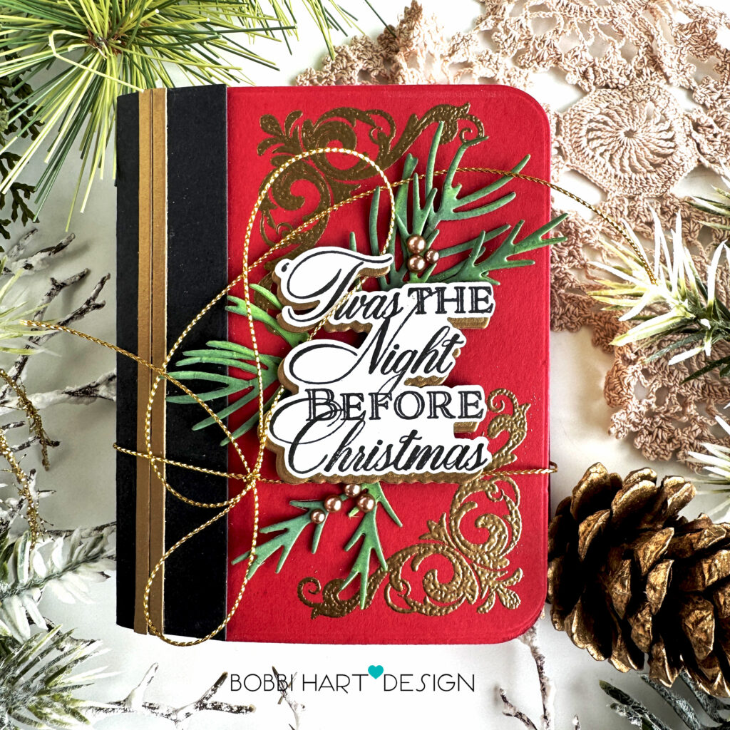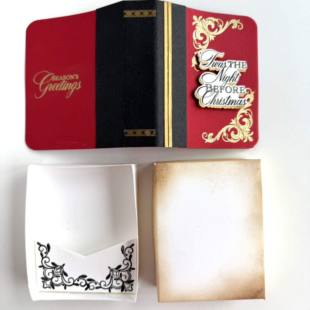 For the book’s exterior cover, stamp in Versamark Watermark Ink Pad and emboss with gold embossing powder similar to this powder, the Merry Motifs Stamp Set corner scroll design in two corners on the front of the book and the “season’s greetings” on the back of the book. Use a line design for the spine, stamping at the top and bottom on the black spine reinforcement. Stamp the “‘Twas the Night Before Christmas” title in True Black Dye Ink on Stamper’s Select White cardstock and die cut the design. Die cut a shadow layer from gold metallic cardstock. Layer the two, offsetting it a bit for the gold shadow to show at the bottom and on the left side of the title. This makes it just a little more dramatic on the cover!