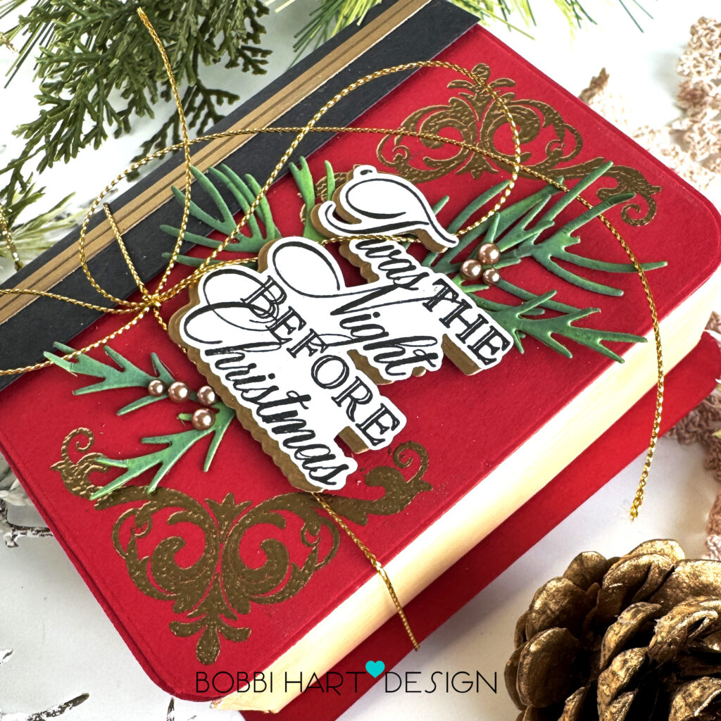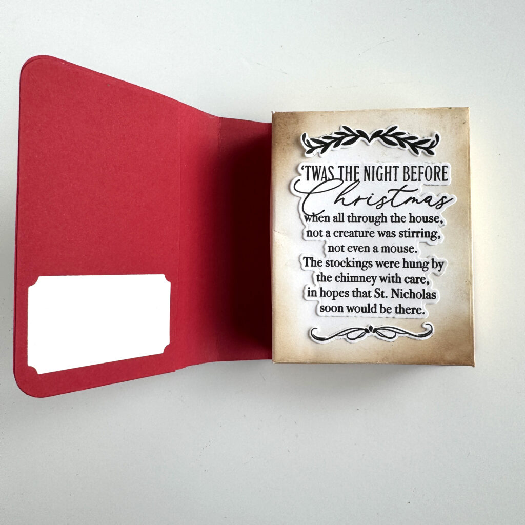 Step 3 – Attach the box to the inside of the book’s back cover. Use 1/4″ double-sided Scor-Tape for extra-firm adherence. It will help when the box is opened/closed. Stamp the verse and accent pieces from the Twas the Night Before Christmas Mini Stamp Set and coordinating dies using True Black ink on white cardstock. Attach to the top of the box to appear like the first page of the story.