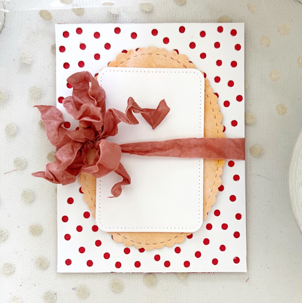 STEP 4: Adhere white die cut rectangle to center of card. Tie a bow around center of card using scrunched seam binding.