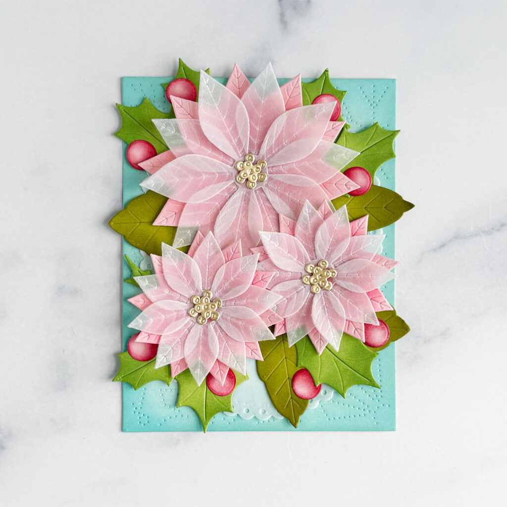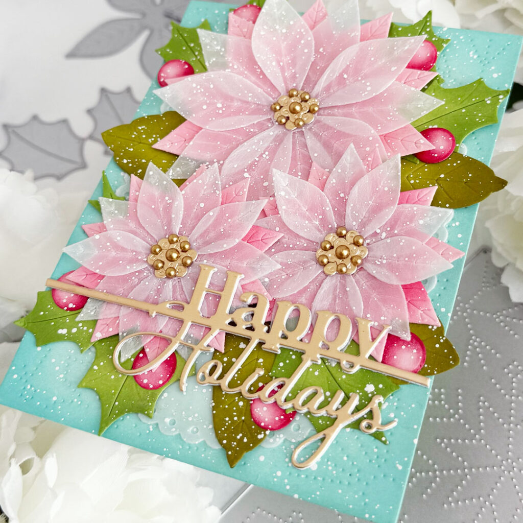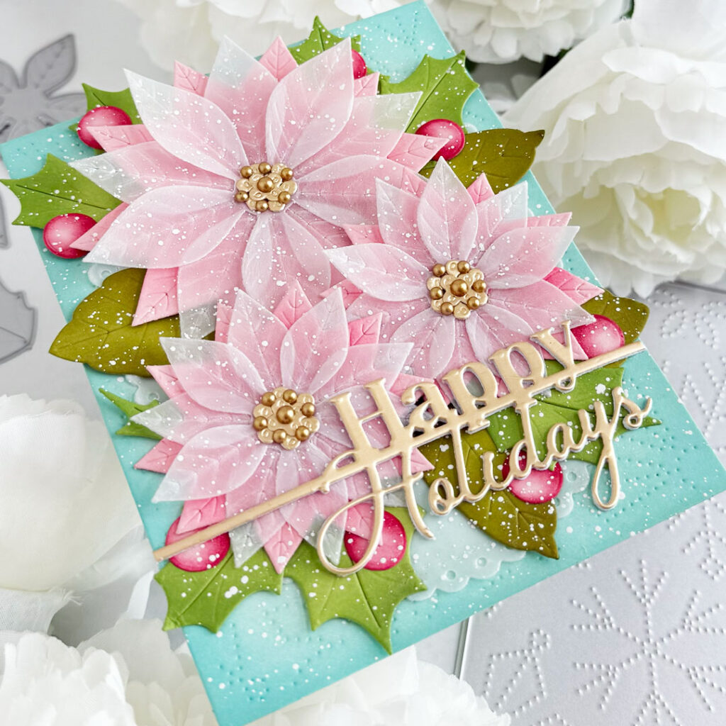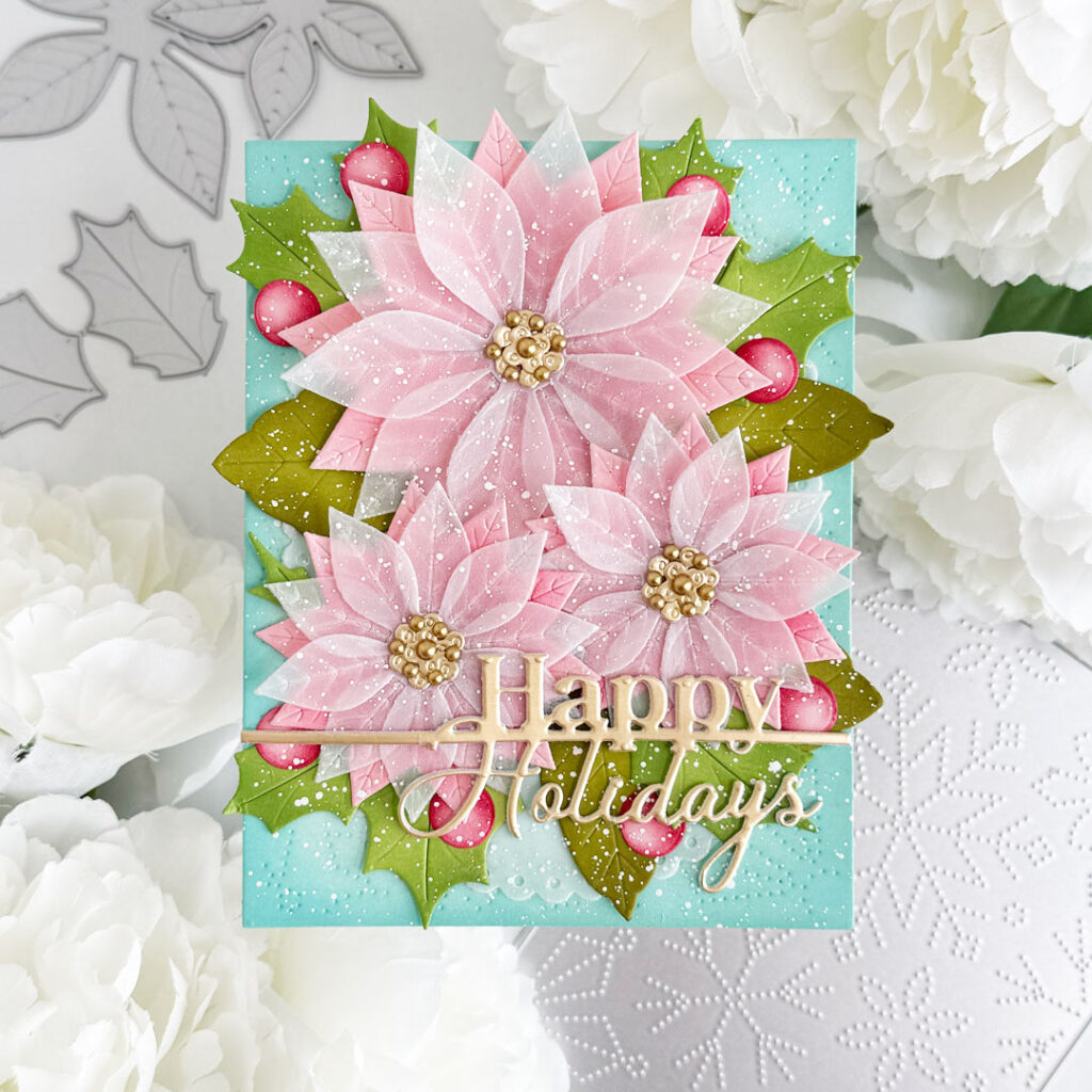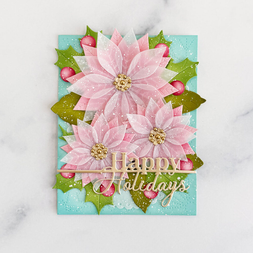 Step: 4: Die-cut the poinsettias from the Into the Blooms: Poinsettia Die Set and berries from the Into the Blooms: Holly Dies from Pale Peony cardstock. Add shading with Pale Peony and Pure Poppy ink. Die-cut the poinsettias from vellum and the centers from matte gold cardstock. Stack and adhere them together, then adhere to the background with foam squares. Splatter with diluted white bleed-proof ink and a paintbrush.