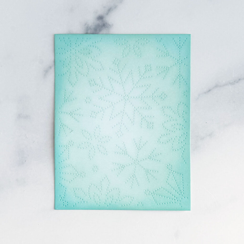 Step 1: Die-cut the Cover Plate: Stitched Snowflakes Die from Stamper’s Select White cardstock. Blend Aqua Mist and Hawaiian Shores ink onto the panel with a blending brush, darker around the outside and lighter in the center.