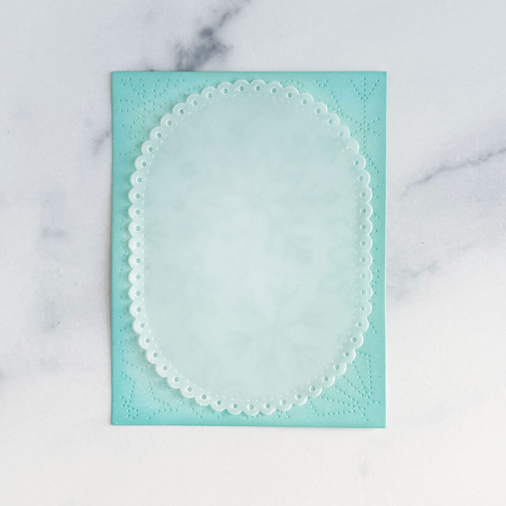 Step 2: Die-cut the largest die in the Love to Layer: Scalloped Ovals Die Set from vellum and adhere to the background panel, adding glue only in the center.