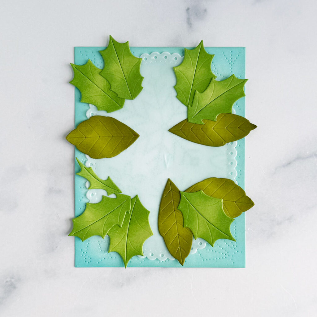 Step 3: Die-cut the leaves in the Into the Blooms: Poinsettia Die Set from Simply Chartreuse cardstock and the leaves from Into the Blooms: Holly Die Set from Green Parakeet cardstock. Use blending brushes to add shading to the leaves with Ripe Avocado and New Leaf ink.