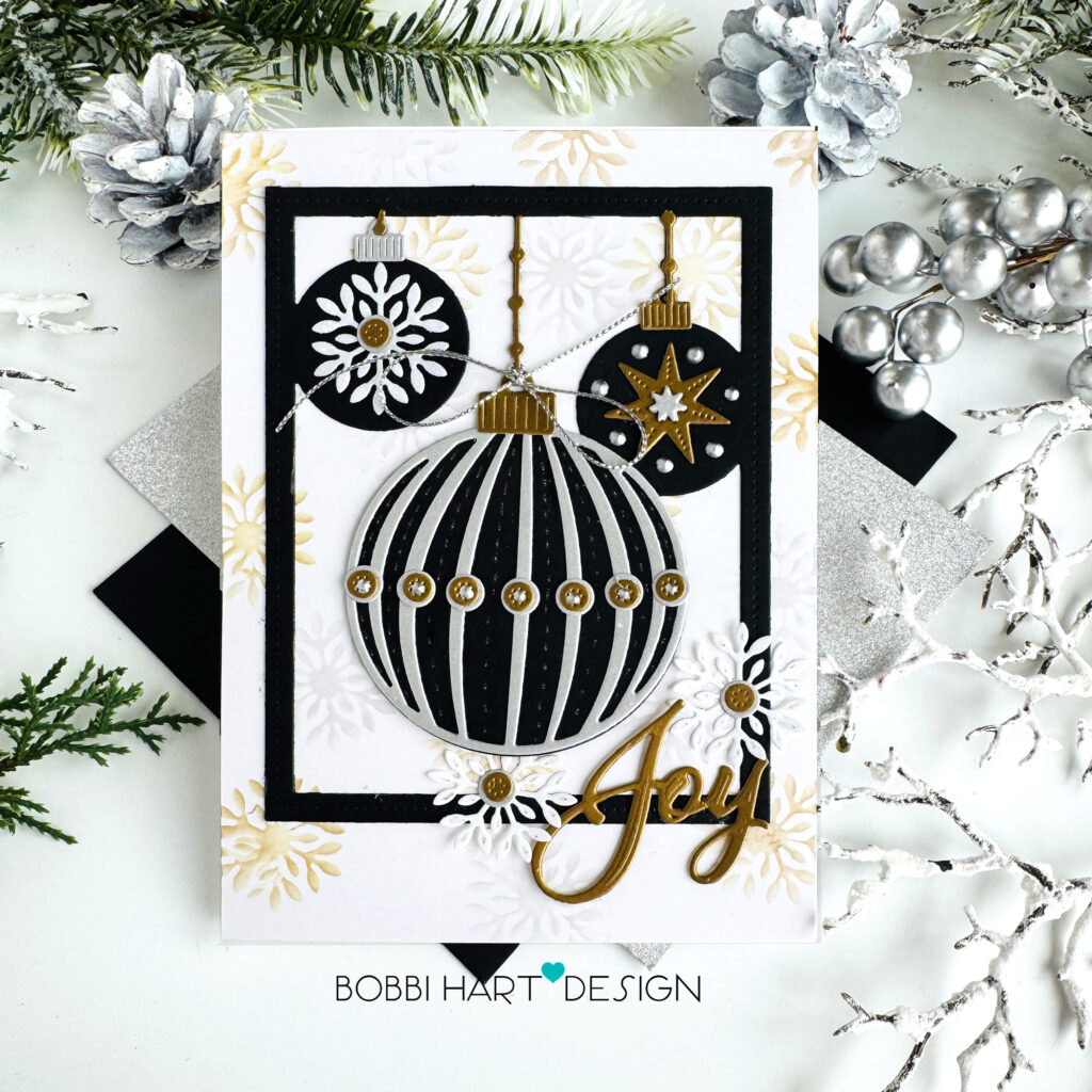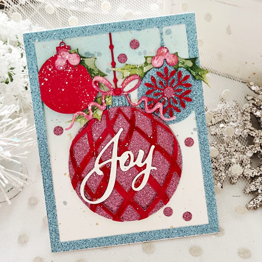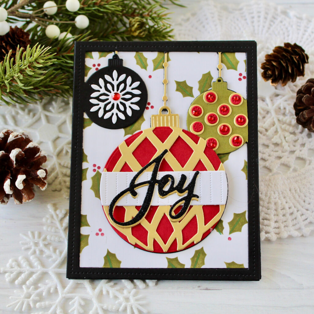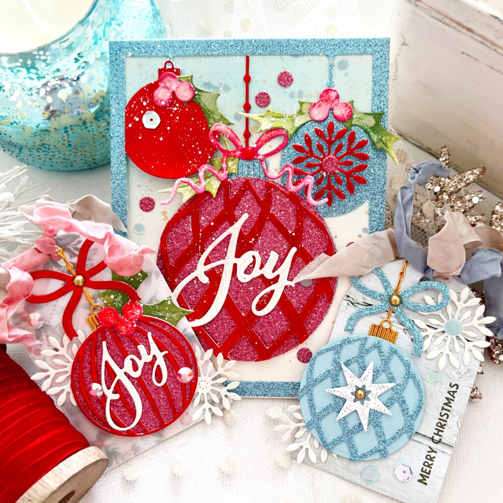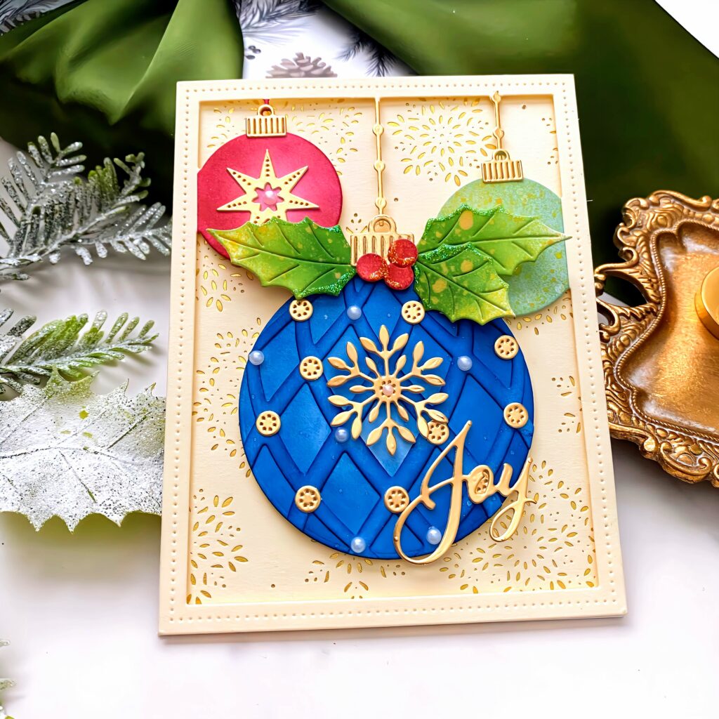 A beautiful way to build layered ornament scenes in one pass. Mix the detailed overlays, stars, and decorative pieces to create eye-catching holiday cards with texture and shine.