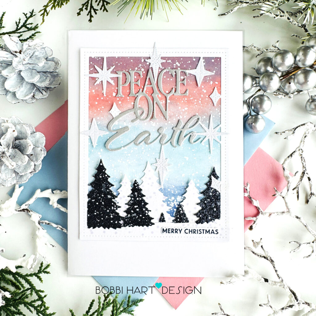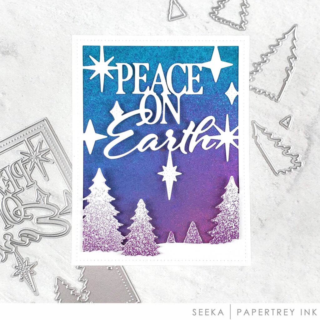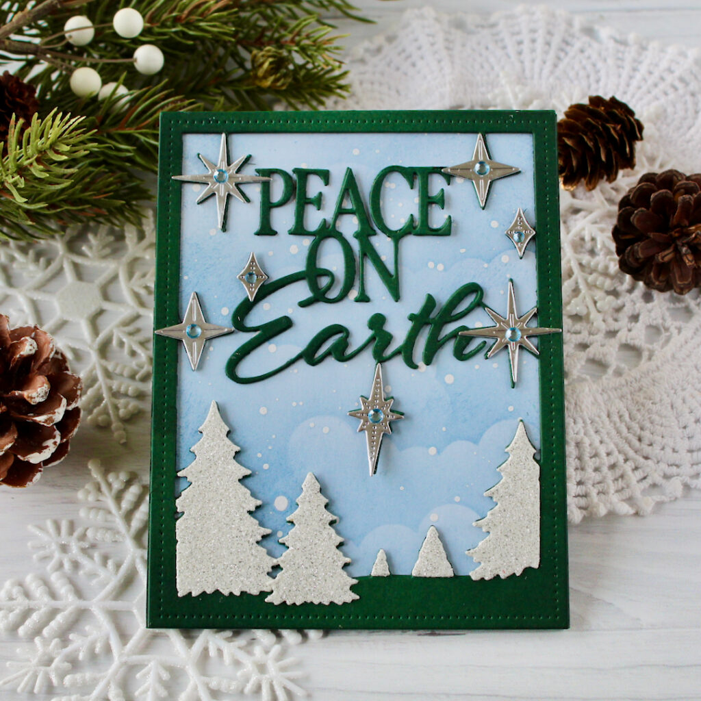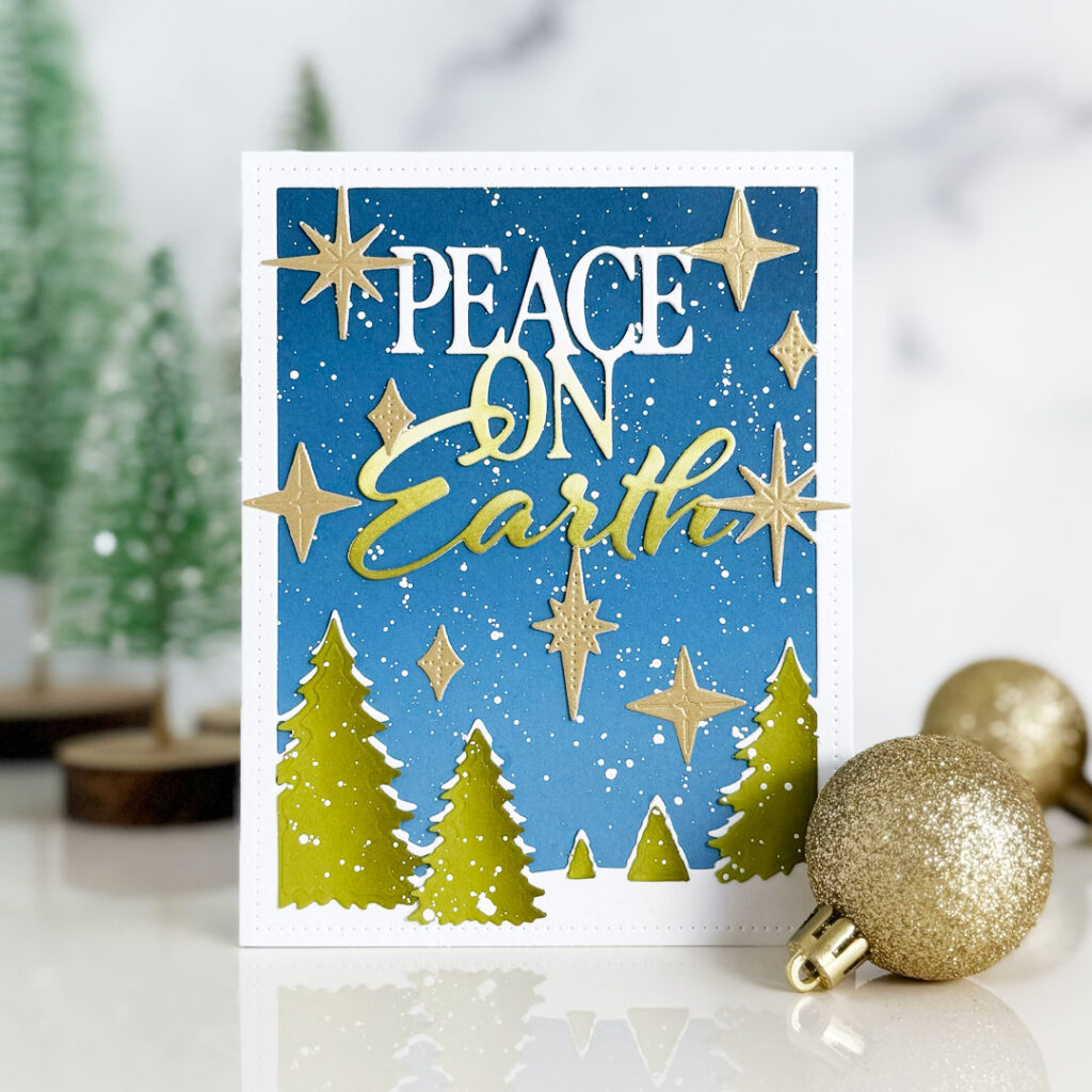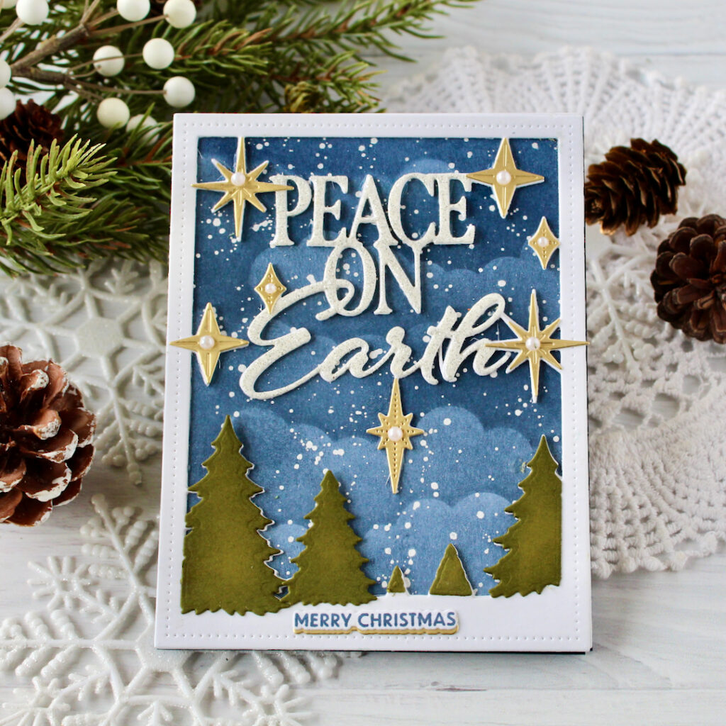 Create a peaceful winter scene with a bold sentiment, glowing stars, and layered evergreens, all in one cohesive design that makes holiday cardmaking quick and beautiful.