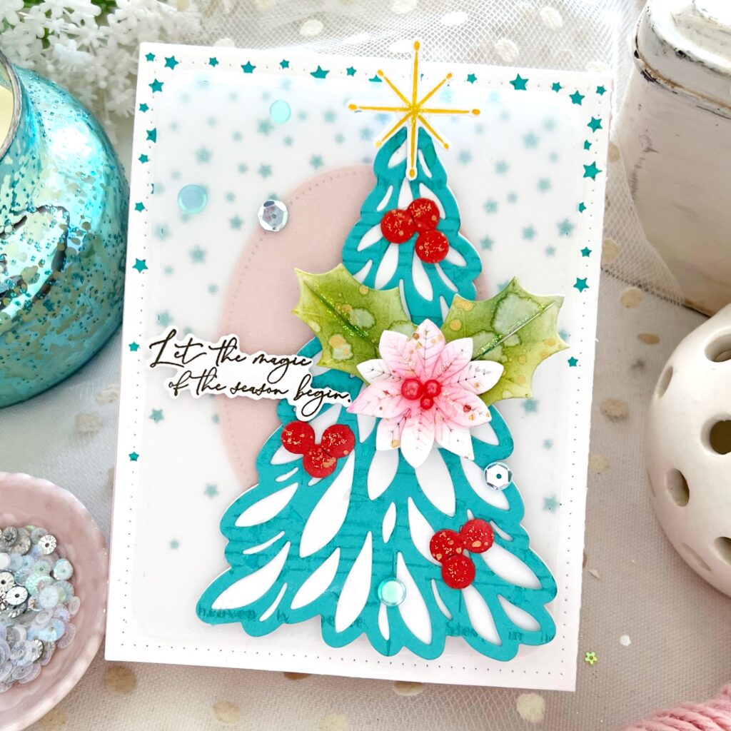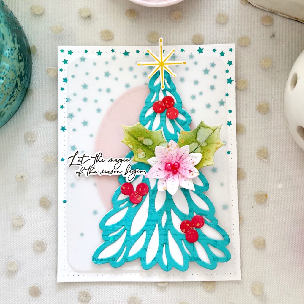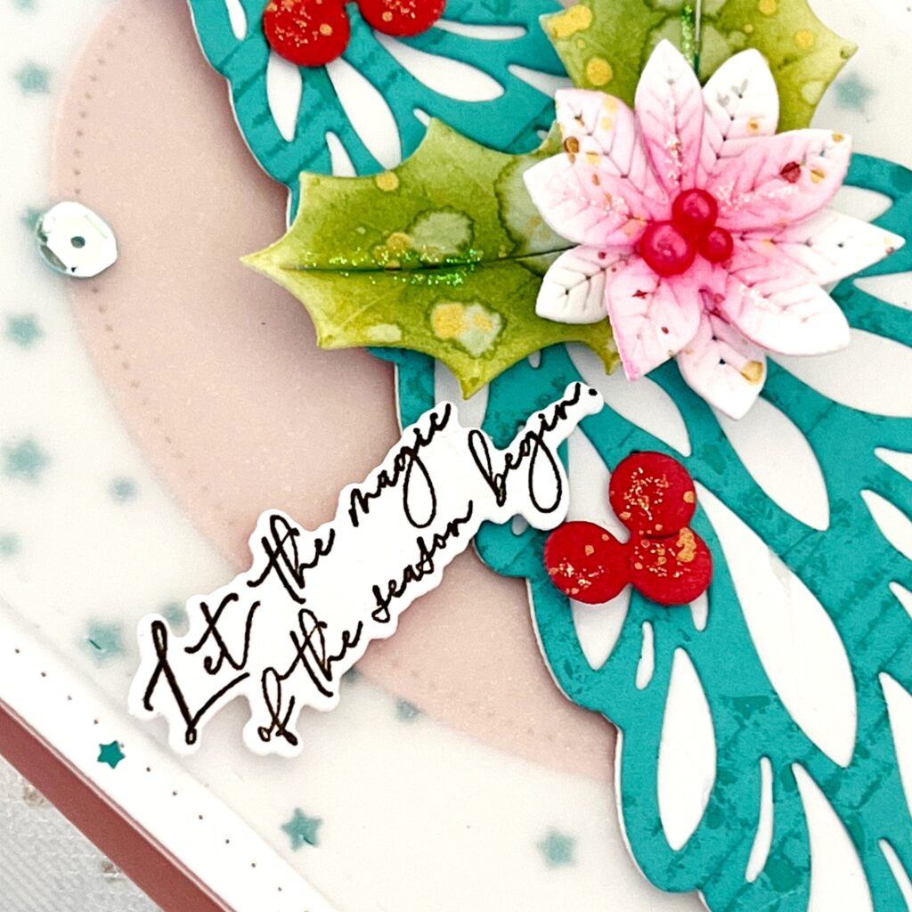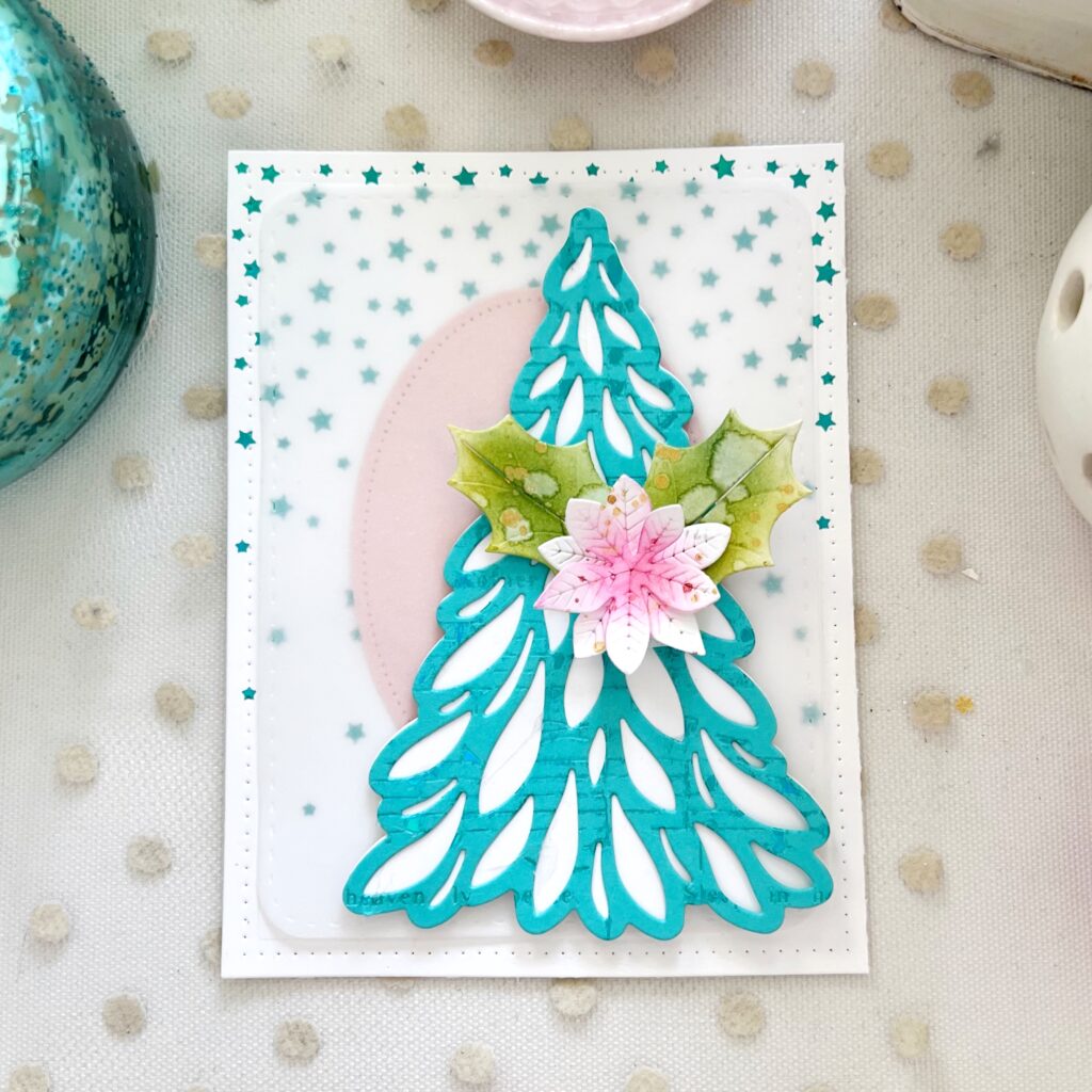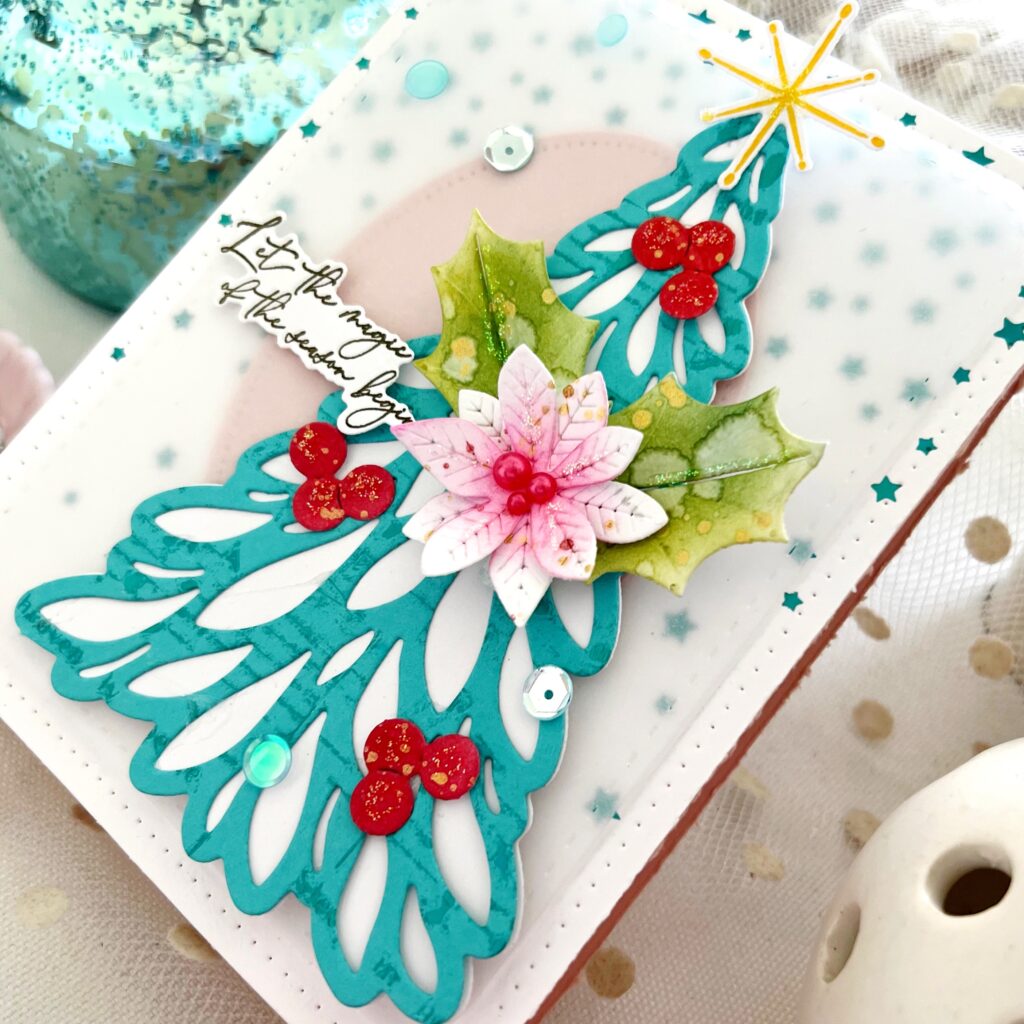 Melissa Phillips brings a fresh twist to traditional Christmas crafting with her Magic of the Season card. With bright aqua tones, soft pink layers, and glimmering accents, this design captures the playful side of the holidays while still feeling elegant and festive. Every detail, from the foiled stars to the layered poinsettia, adds a touch of shimmer and warmth to her merry creation.