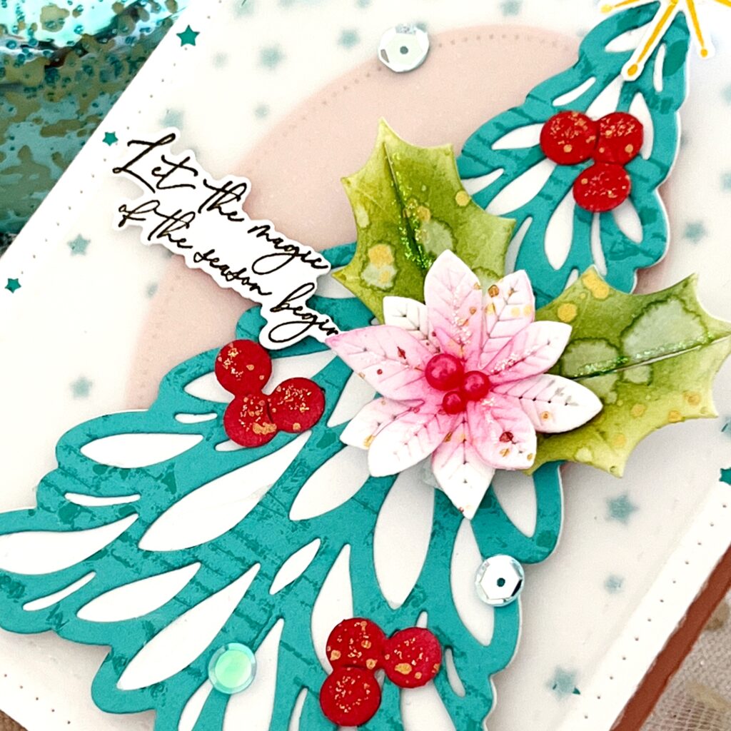 STEP 5: Ink blend die cut poinsettia and holly leaves, add water droplets and spritz with Distress Sprits. Assemble and adhere to evergreen.