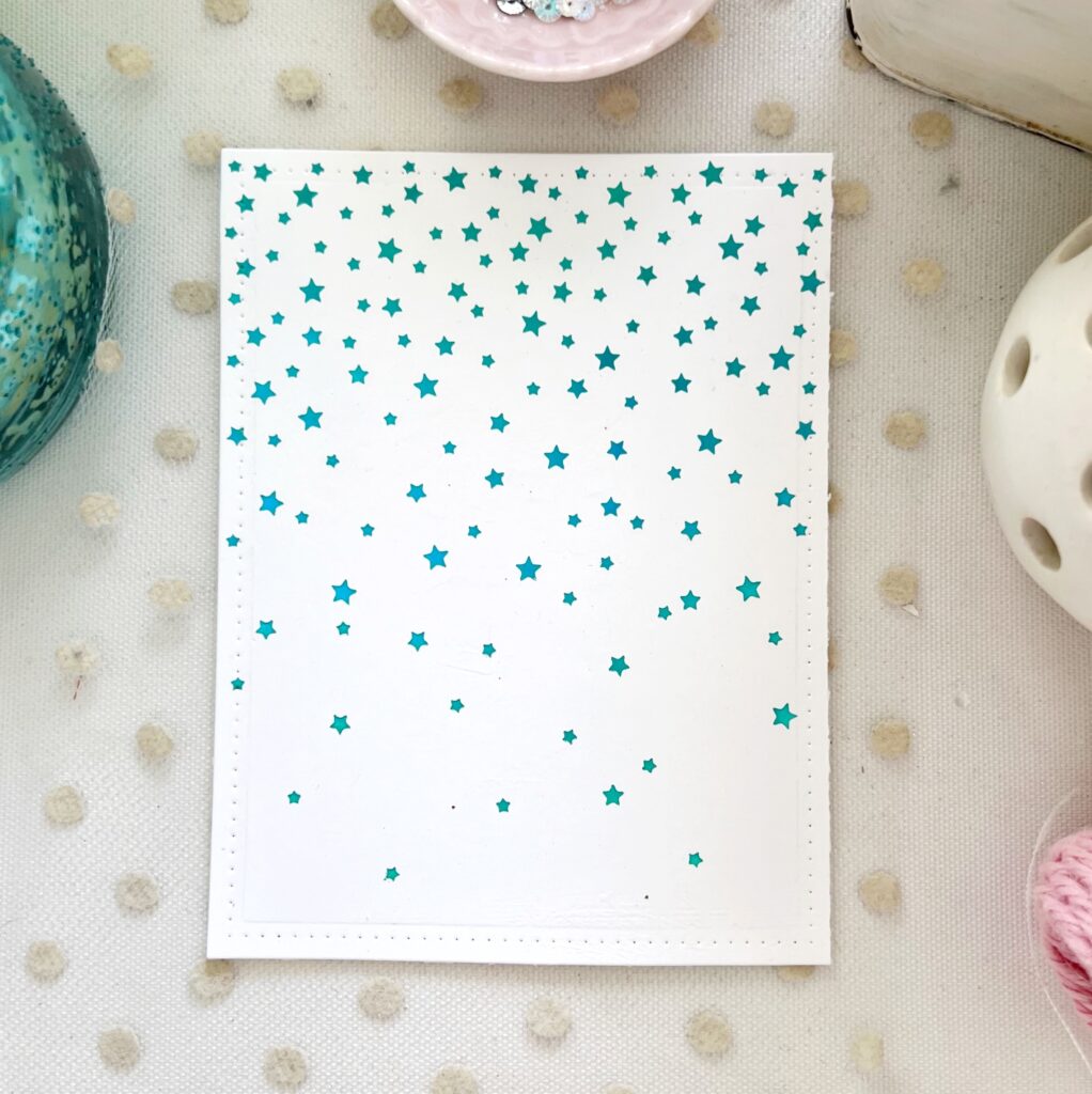 STEP 1: Create card base from white cardstock using the Cascading Stars Hot Foil Plate and aqua foil.