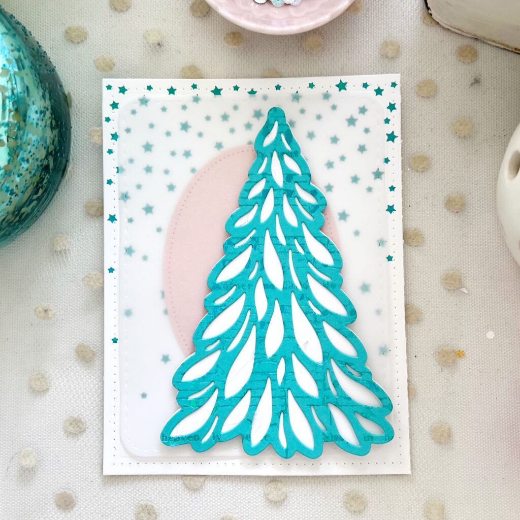 Melissa shares, “Aqua trees for Christmas? Why yes, please! Christmas has no limits when it comes to color combinations, so for my card today, I’ve chosen colors merry and bright to bring in the holiday festivities. I’ve also used two different hot foil plates to add extra shimmer, shine, and pattern. Follow along as I walk you through my process.”