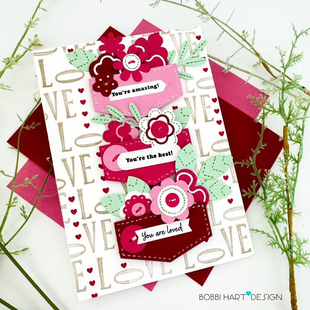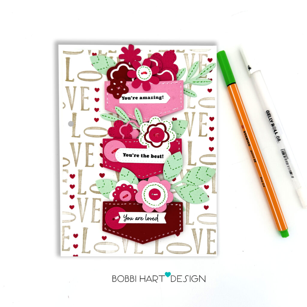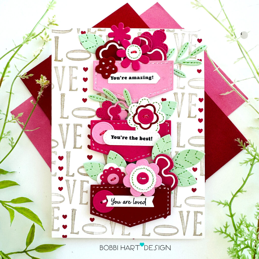 Hi friends! Today, I hope to inspire you with the cutest stitched pockets of “cute as a button” florals and leaves. With Valentine’s day two months away, it’s time to pull out the pinks and reds and get busy making cards to share your love! Today’s card features the following Papertrey Ink products: