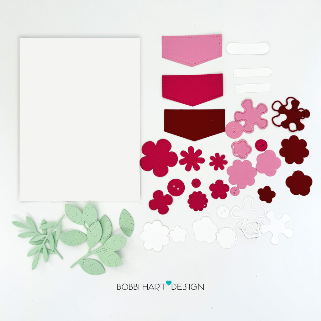 Die cut three labels to use as the pockets using the Hold That Thought Die from three colors: Pale Peony, Raspberry Fizz and Pure Poppy. Using the Into the Blooms: Cute as a Button dies, die cut the greenery from Mint Julep cardstock. Die cut the buttons and florals from the same set using the three pocket colors and white cardstock.