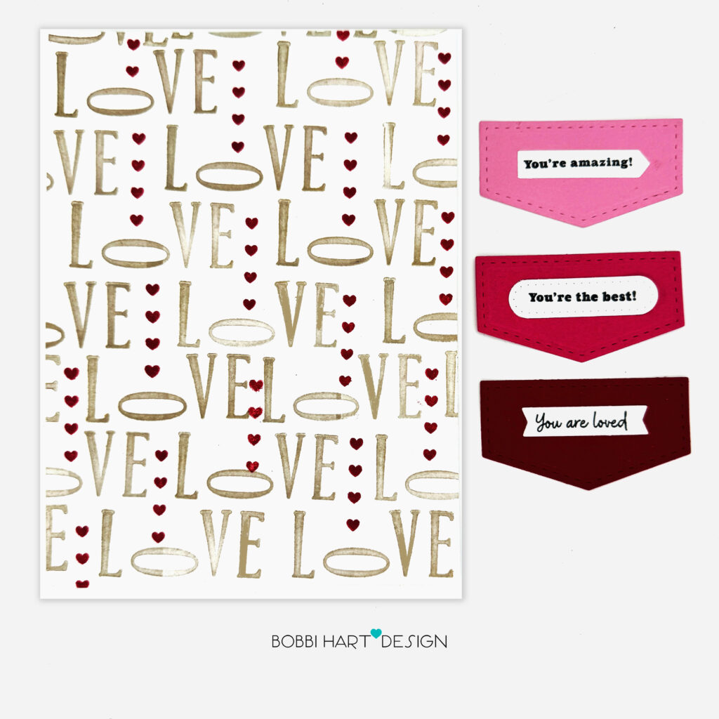 STEP TWO: Create a pattern on the card front using the Classic Alphabet stamp set, and gold metallic gold ink. Turn the “o” in “love” on the side for a fun pattern. Using the Just a Note stamp set, stamp the vertical stacked tiny hearts over the “o” letter using Pure Poppy dye ink.
