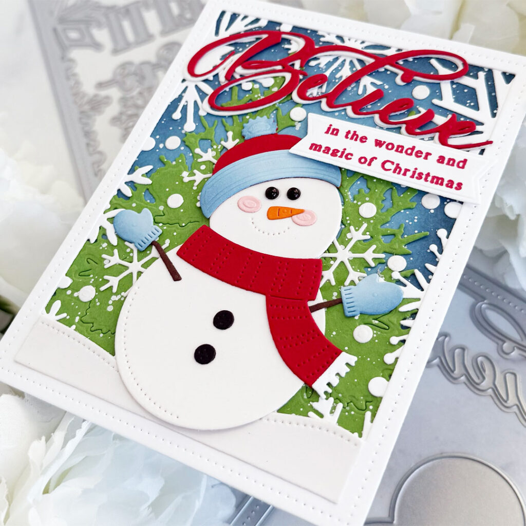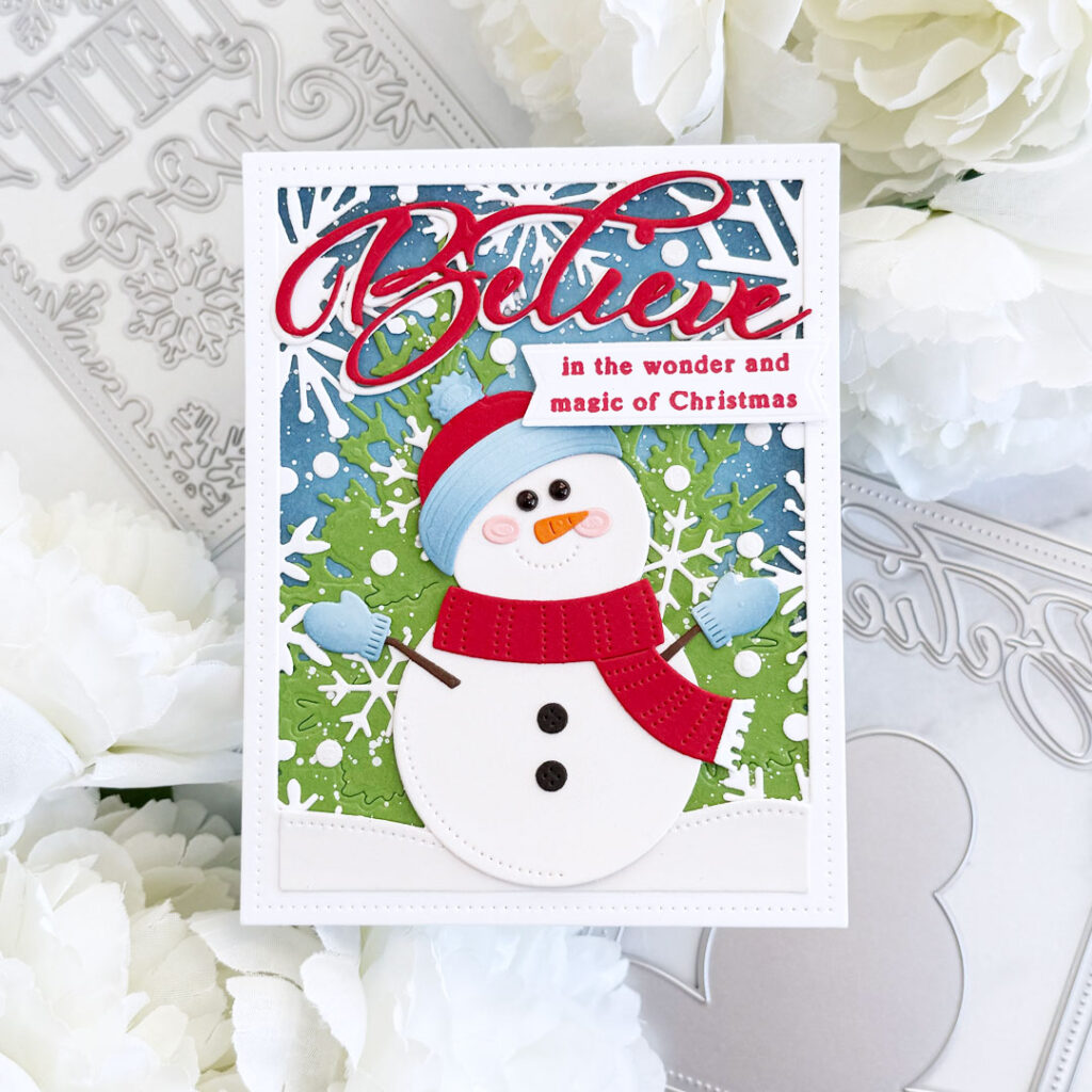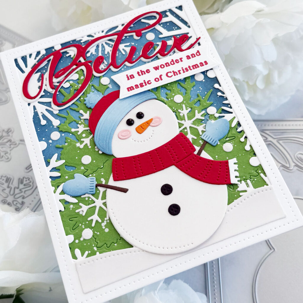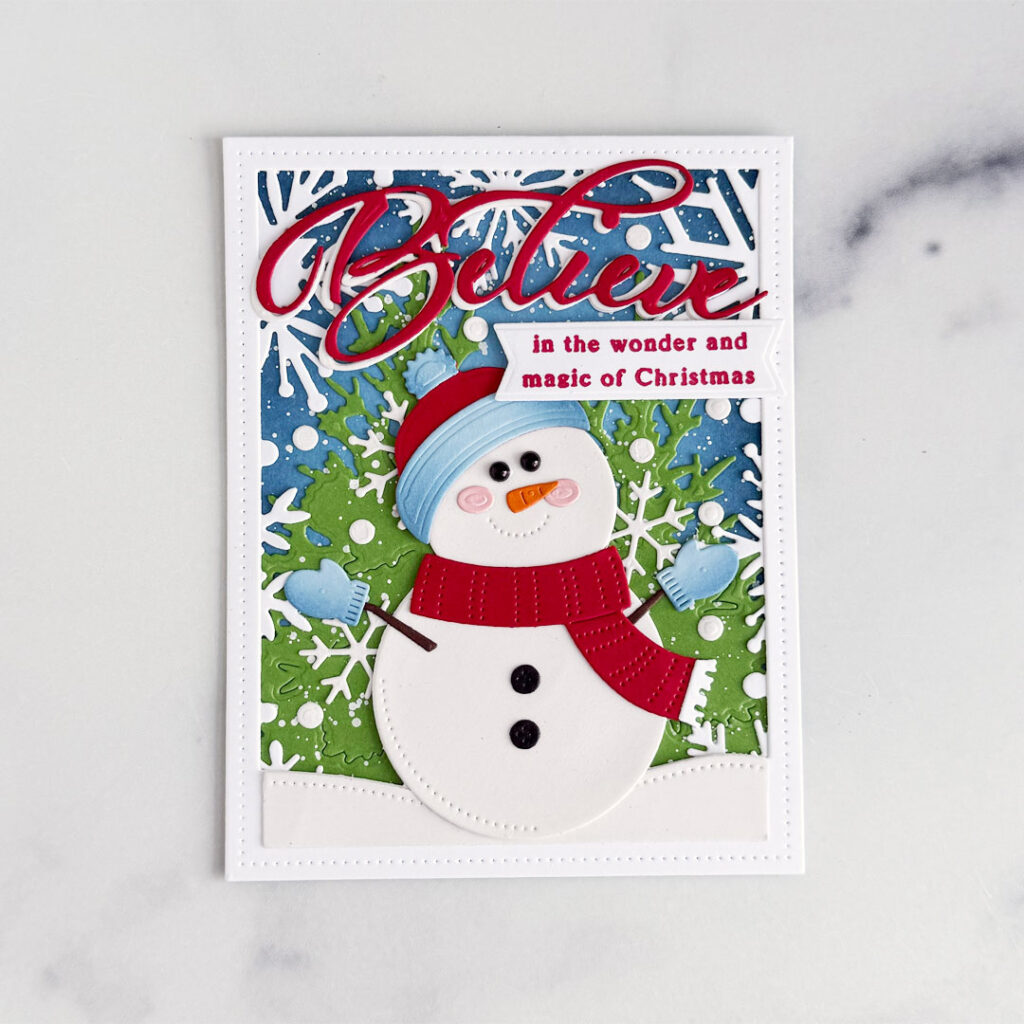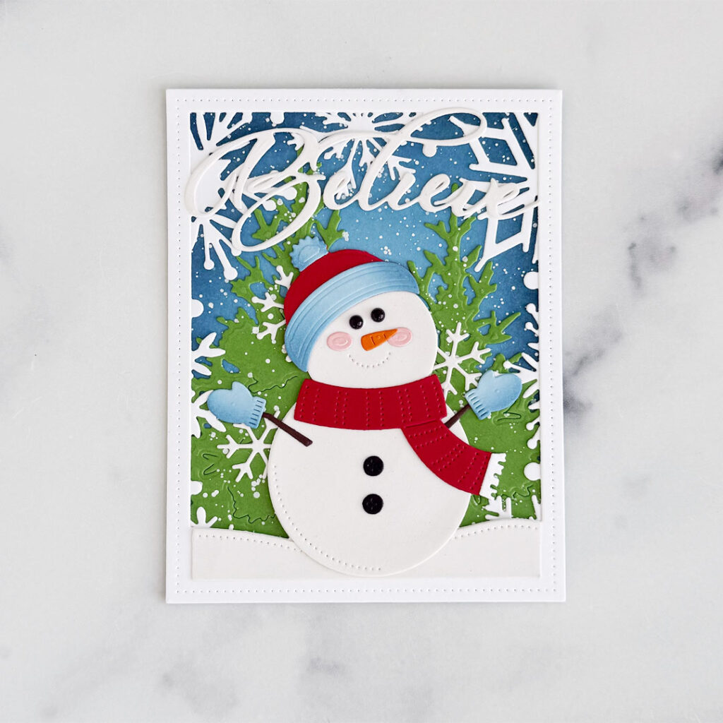Step 5: Die-cut the snowman, snowbank and accessories in the Cover Plate: Snowman Die Set from white glitter, Pure Poppy, Spring Rain, Pale Peony, Orange Zest, Dark Chocolate and True Black cardstock. Add a bit of Blueberry Sky and Spring Rain inks onto the blue accessories using a blending brush and adhere all the snowman die-cuts together with liquid glue. Die-cut snowflakes and snowballs in the Cover Plate: Let It Snow Die Set from Stamper’s Select White and white glitter cardstock. Adhere snowflakes, snowbank, snowman and snowballs to the background. Add black beads for the snowman’s eyes.