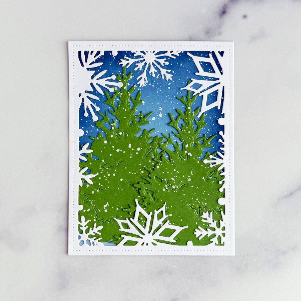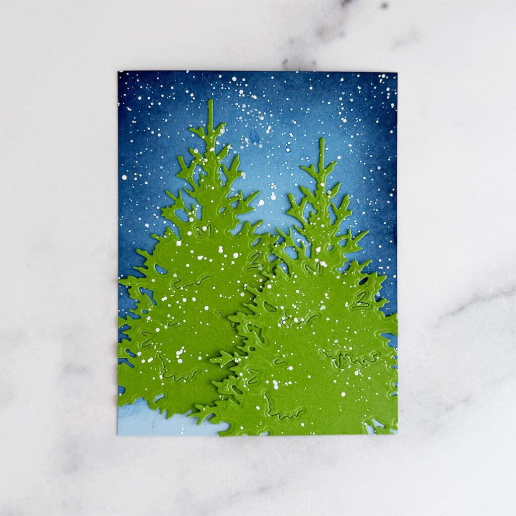 Step 2: Die-cut the tree from the Build-A-Christmas Tree Die Set twice from New Leaf cardstock and adhere them to the background, trimming the excess from the edges. Splatter with more white bleed-proof ink.