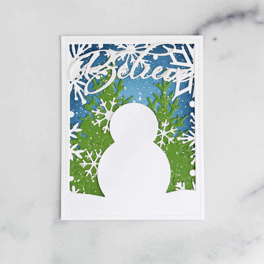 Step 3: Die-cut the Cover Plate: Let It Snow Die from Stamper’s Select White cardstock. Trim away the center snowflakes and sentiment, then adhere to the background.