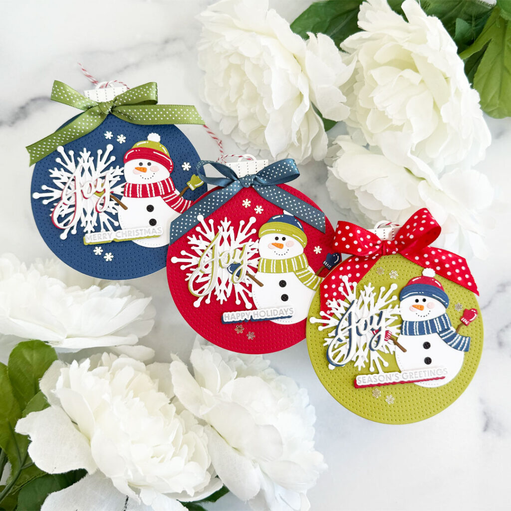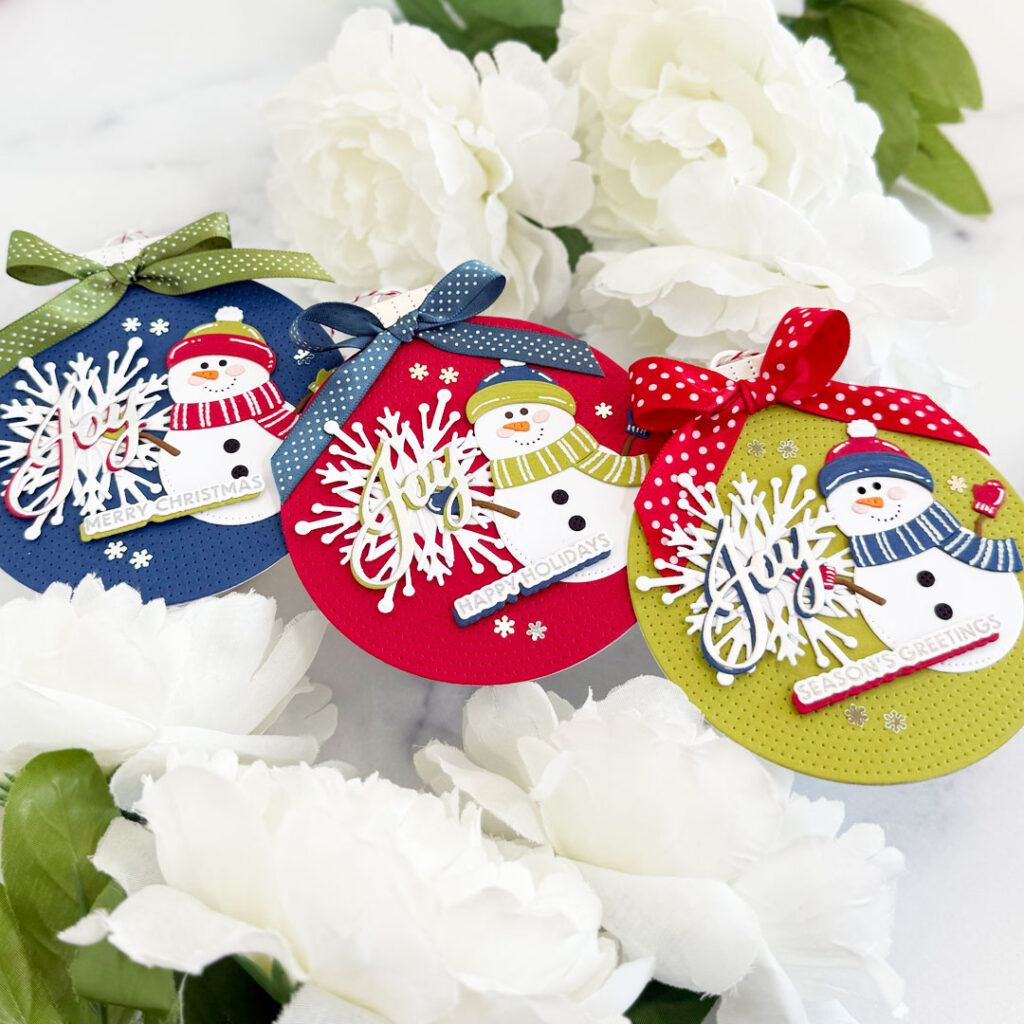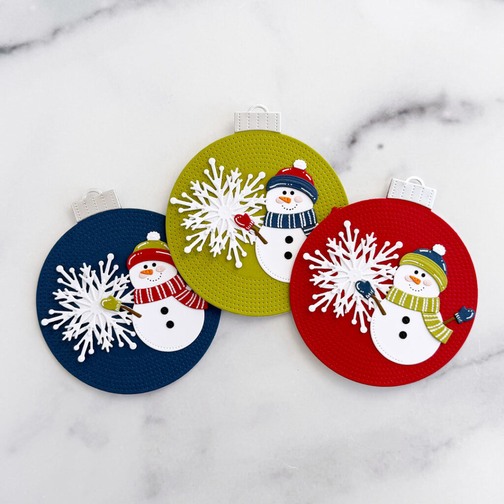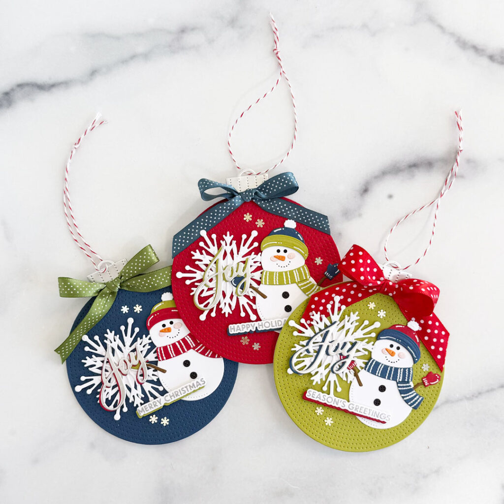 I decided to combine some of the Holiday Tag Die Sets from the latest release with the Timeless Ornament Die Set to create some snowman ornaments that double as gift card holders!!