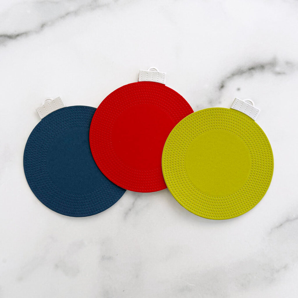 Step 1: Die-cut the Timeless Ornament Die Set from Enchanted Evening, Pure Poppy, Simply Chartreuse and frosted silver cardstock and adhere the die-cuts together with liquid glue.