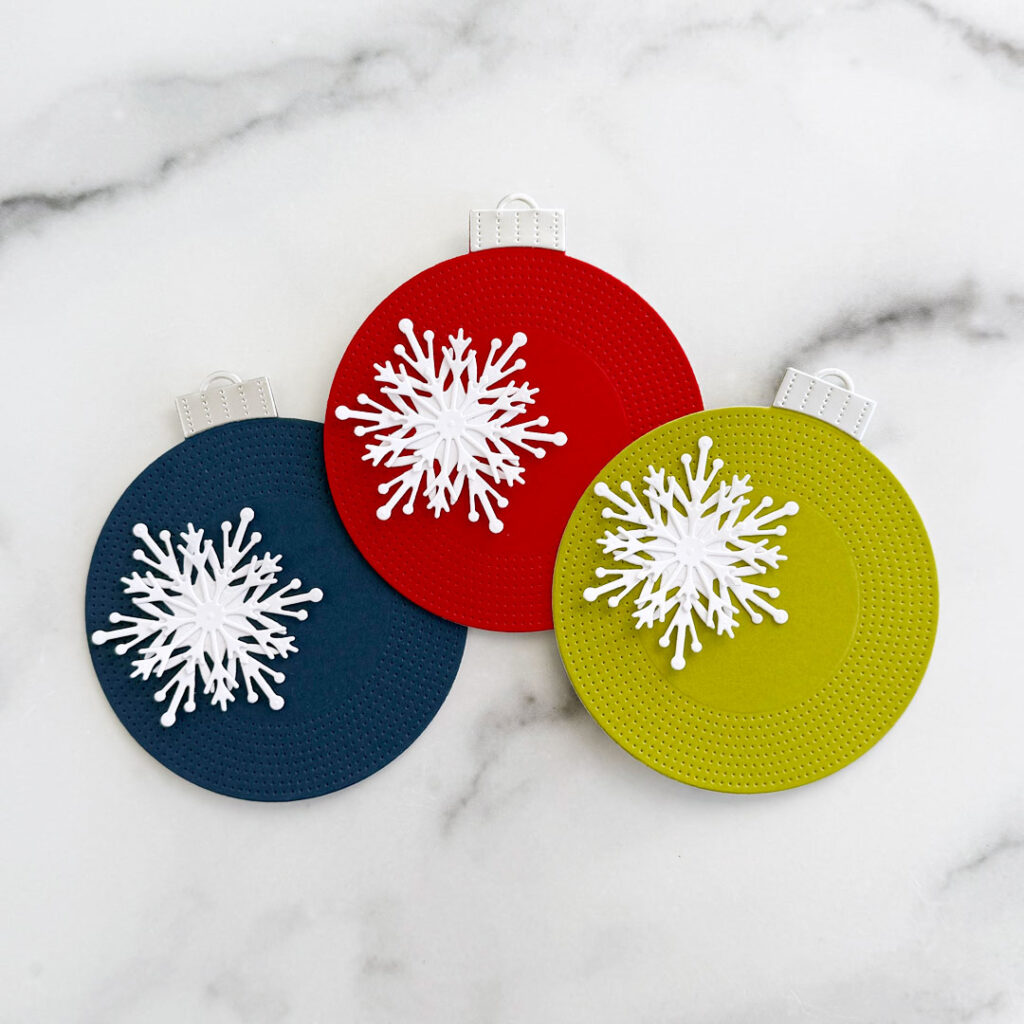 Step 3: Die-cut the snowflakes in the Holiday Tag: Let It Snow Die Set from Stamper’s Select White cardstock. Stack and adhere them to the ornaments with liquid glue.
