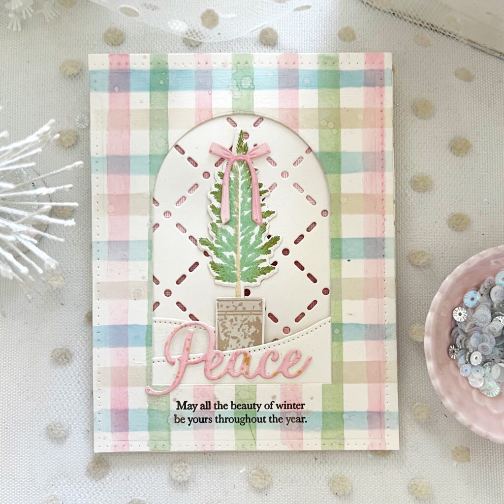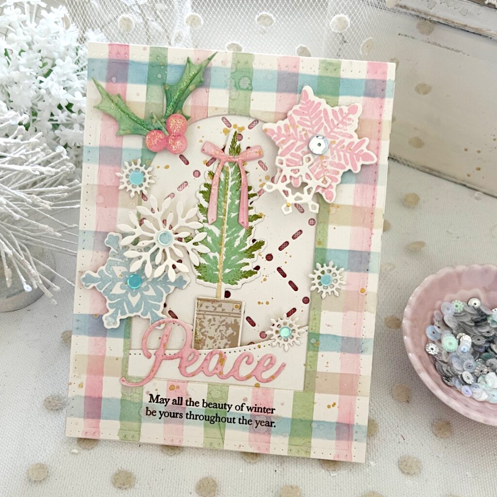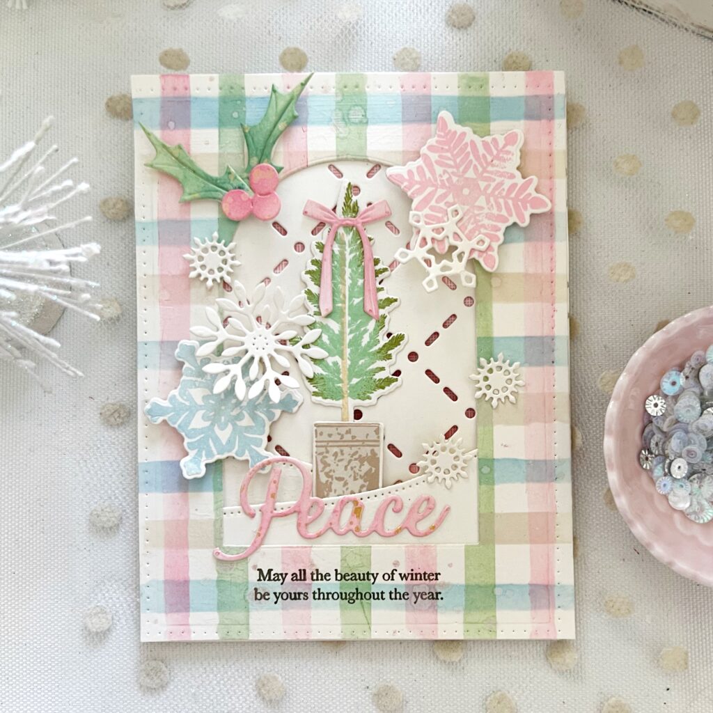 Melissa Phillips brings soft winter beauty to her Peace card, crafting a scene that feels gentle, sparkling, and full of seasonal wonder. ❄️🌲 Using a plaid–stenciled background and a die-cut window to frame a charming potted tree, Melissa layers in snowflakes, holly, and a sentiment that speaks right to the heart. Her pastel palette and glittery touches give this design the sweetest touch of winter magic.