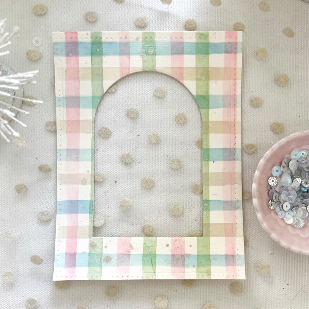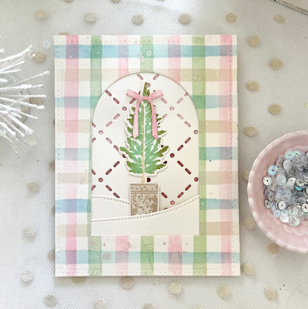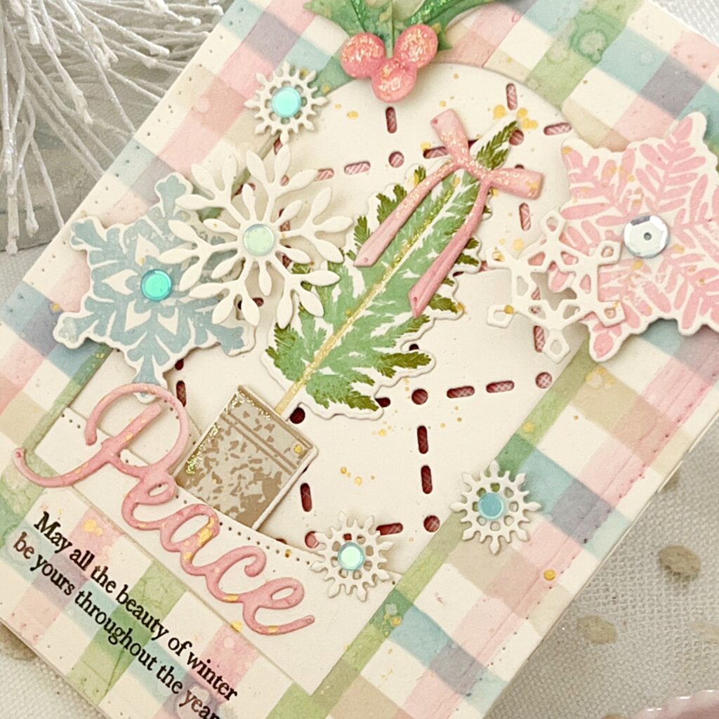 Melissa Phillips brings soft winter beauty to her Peace card, crafting a scene that feels gentle, sparkling, and full of seasonal wonder. ❄️🌲 Using a plaid–stenciled background and a die-cut window to frame a charming potted tree, Melissa layers in snowflakes, holly, and a sentiment that speaks right to the heart. Her pastel palette and glittery touches give this design the sweetest touch of winter magic.
