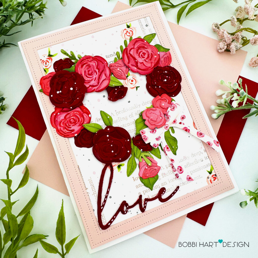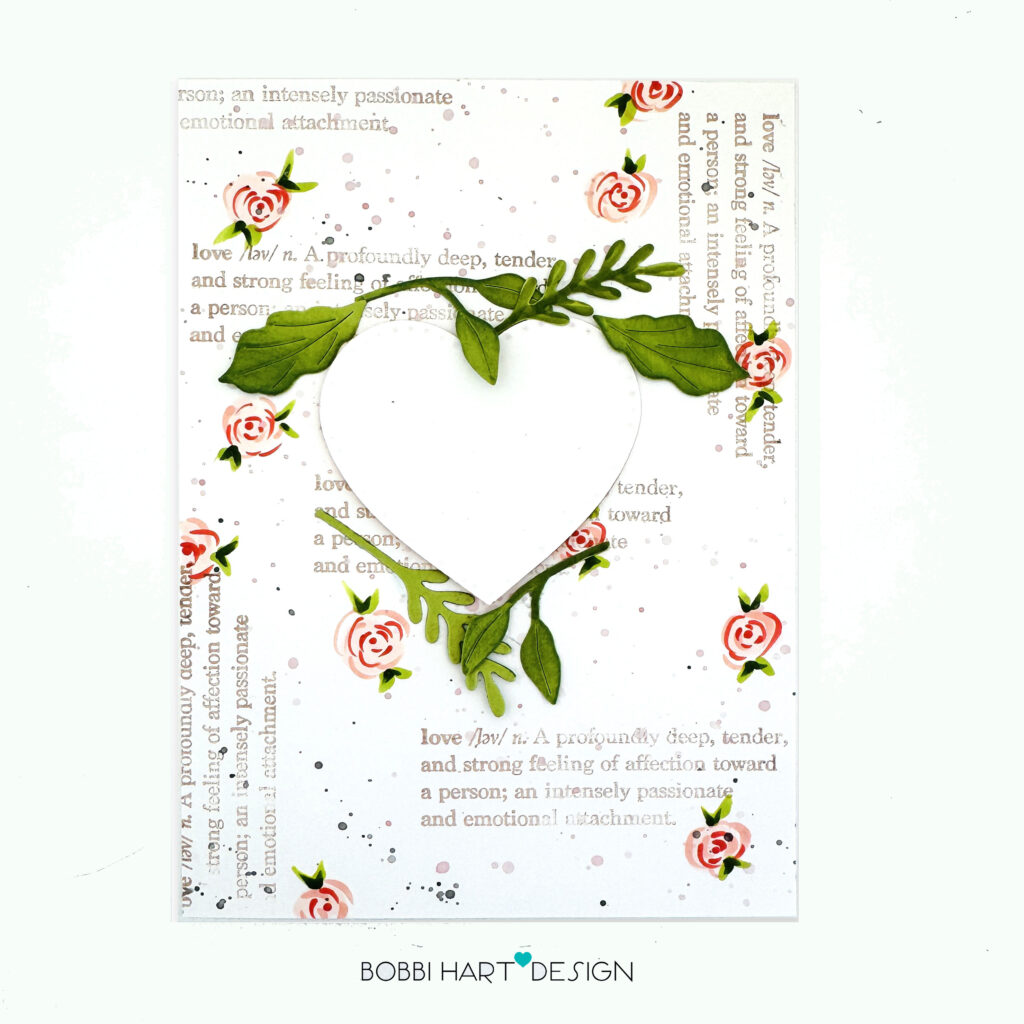Step 6: Attach a border die cut from Sweet Blush cardstock using the A7 rectangle die from the In Frames: Big & Tall Rectangles dies. Cut three “love” scripted words from Pure Poppy, glue the three layers together and attach to the lower left corner, inside the stitched frame. Splatter white ink over the florals.