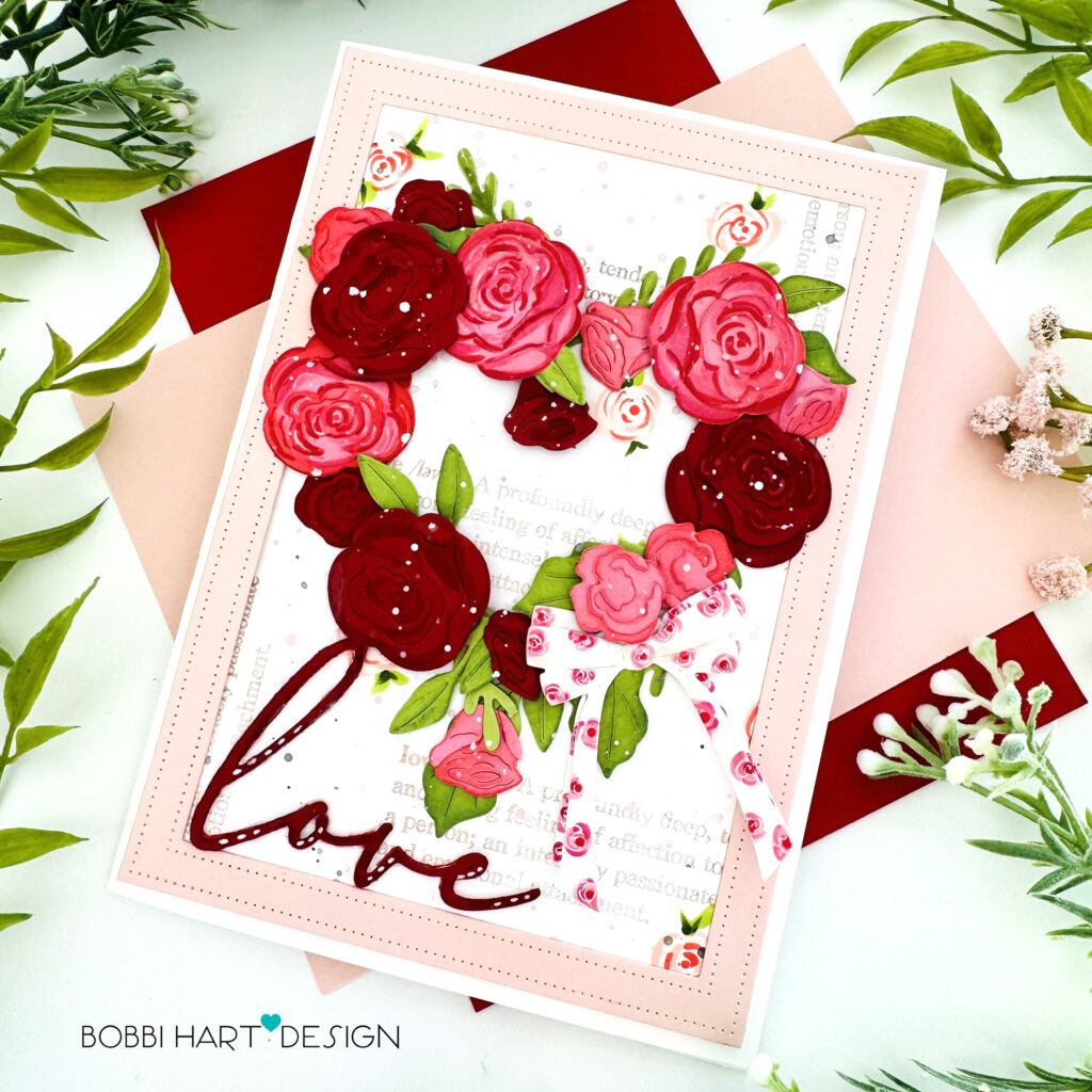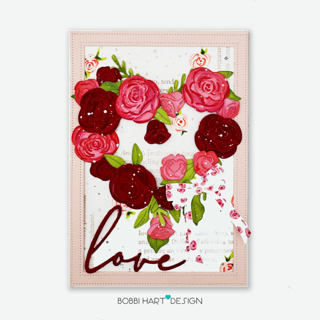 Step 5: Attach the die cut roses, filling in as needed with leaves, blossoms and buds. Use foam tabs under a few of the roses to make the heart dimensional. Add the bows to the lower right section of the heart.