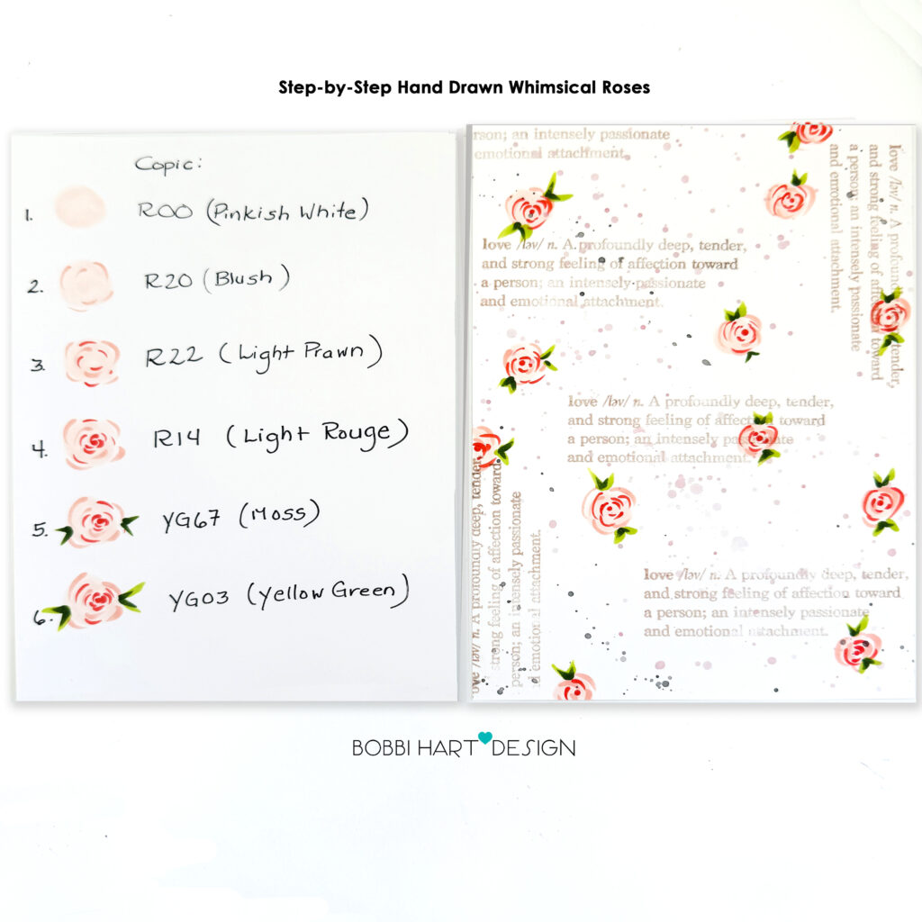 Step 2: Add hand drawn roses randomly, over the splatters and love definition stamped images. Follow the guide above for simple, whimsical roses using Copic and/or other markers.