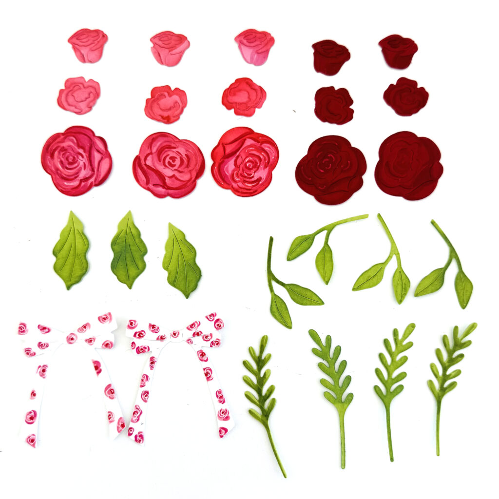 Step 3: Die cut the roses, leaves and bows from the Build-A-Bouquet Dies set. Use Pale Peony and Pure Poppy cardstock for the roses, New Leaf for the leaves and Stamper’s Select White cardstock for the bows. Using the same bow design, add rosettes to the white bows. Shade the roses and leaves using Distress Oxide Inks in Mowed Lawn and Kitsch Flamingo inks and blender brushes.
