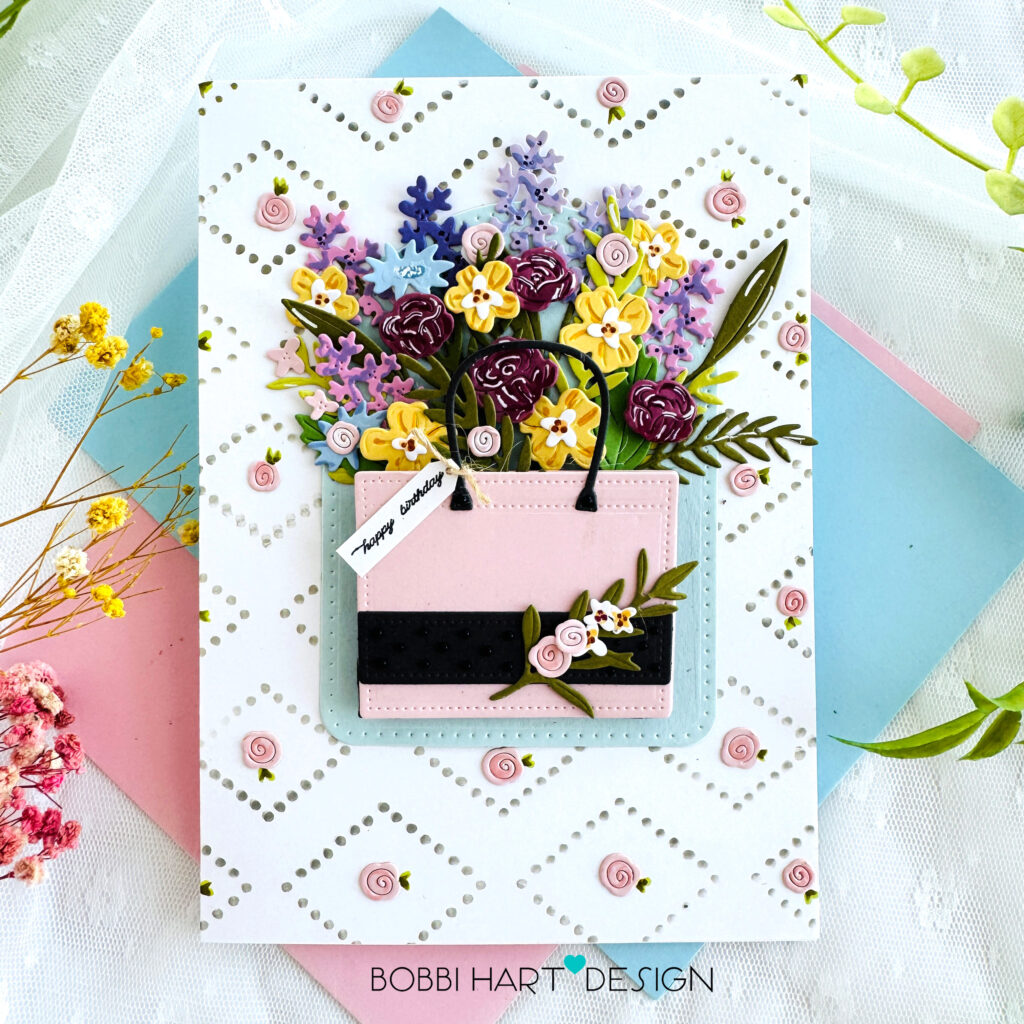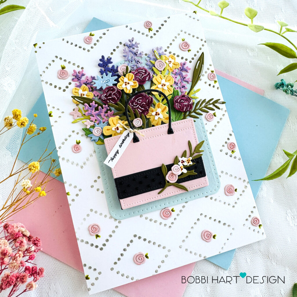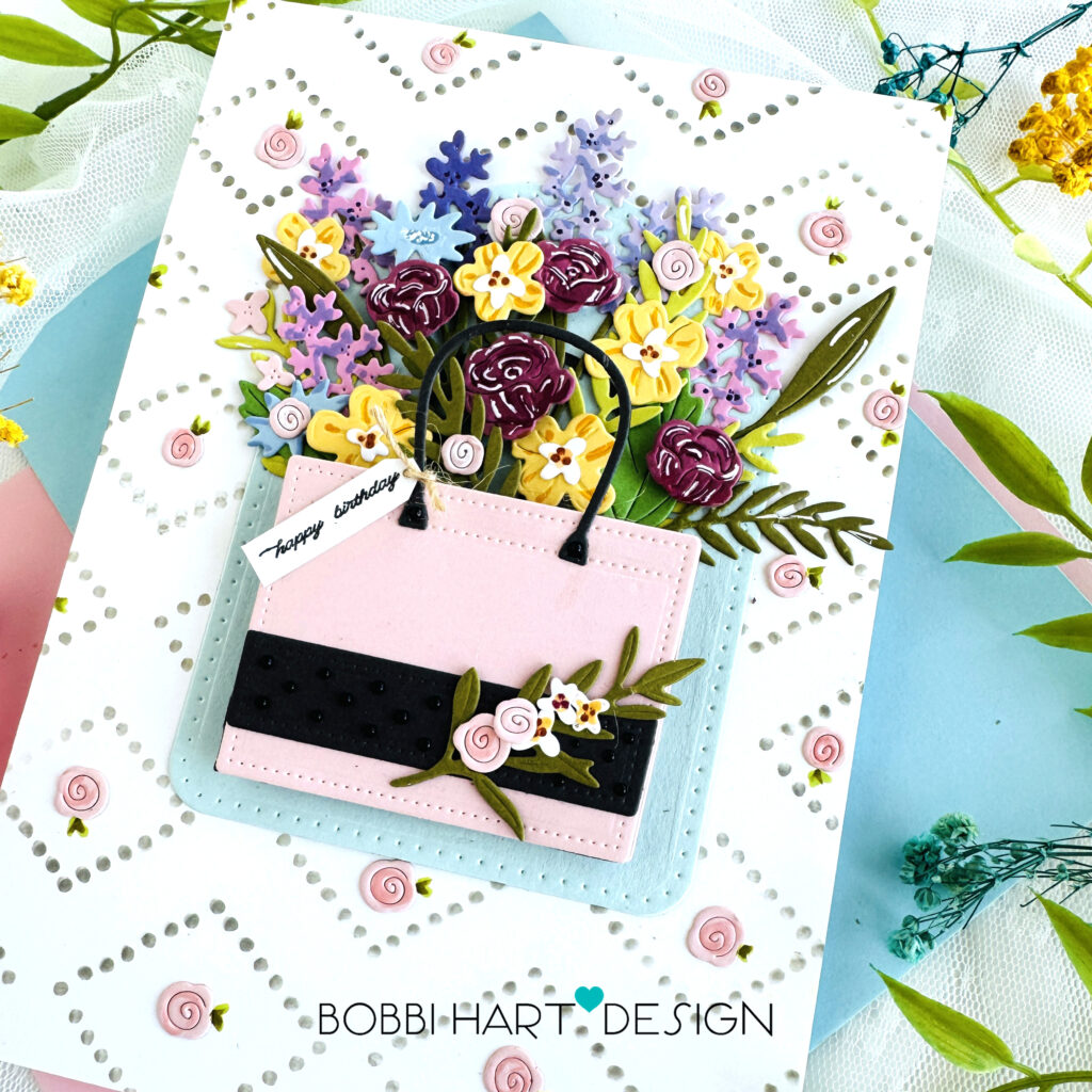 STEP 5: Attach the forefront florals to the tote. Add a stem of greenery and florals to the front of the tote. Glue in place. Die cut additional rose buds from the Sweet Blush cardstock and glue them inside the diamonds. Add some color to each one using a Copic R21 Marker or similar darker pink marker.