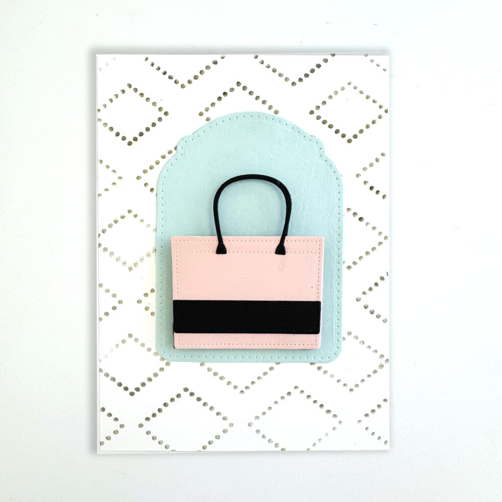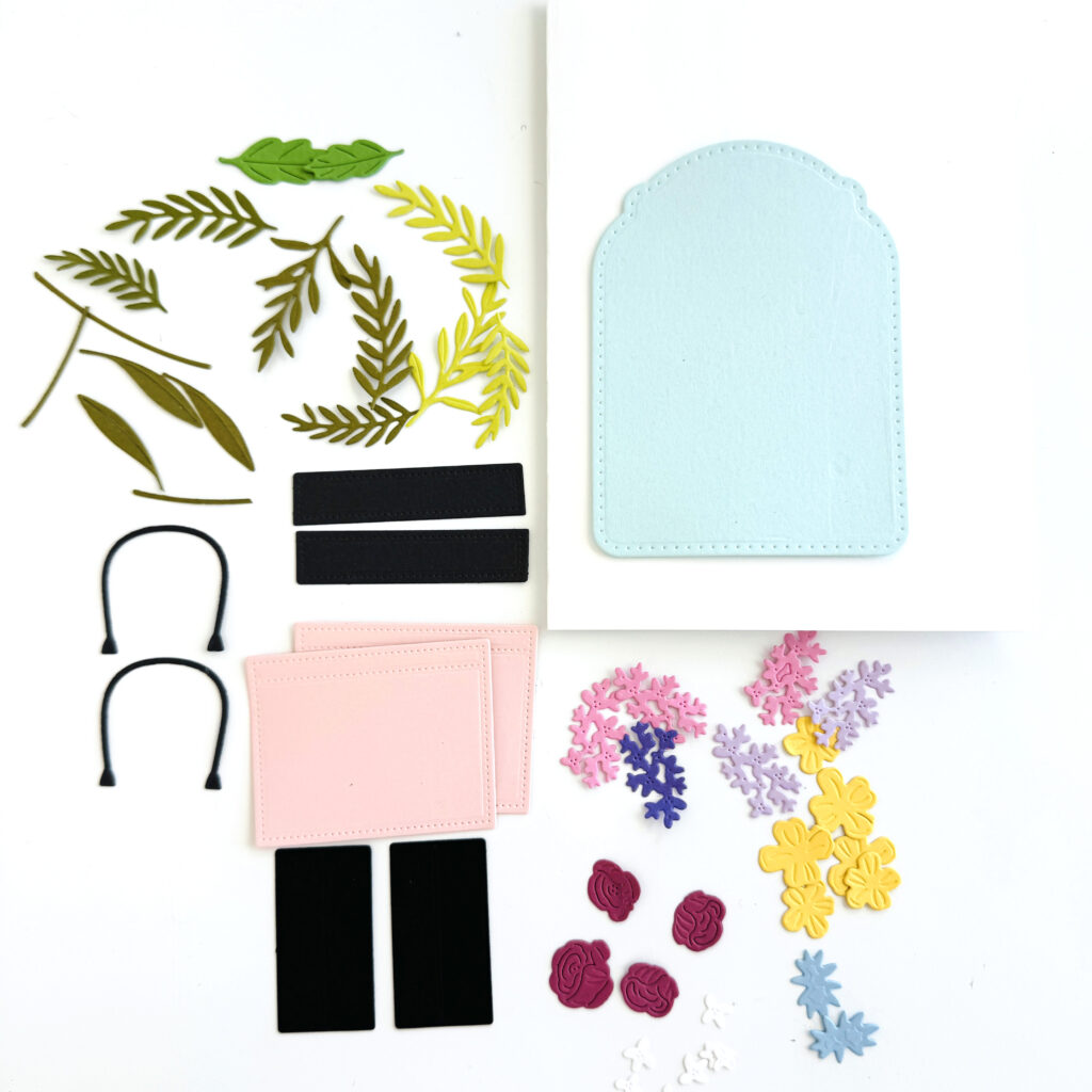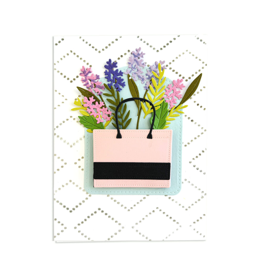 STEP 1: Die cut the tote and floral elements using the following cardstock colors: (Tote) Sweet Blush, Smokey Shadow and True Black, (Florals) Autumn Rose, Spring Rain, Lovely Lady, Lavendar Moon, Harvest Gold, Amethyst Allure, Stamper’s Select White (leaves) Ripe Avocado, Limeade Ice, New Leaf, (stitched label) Aqua Mist and a 5″ X 7″ card base made from Stamper’s Select White cardstock.
