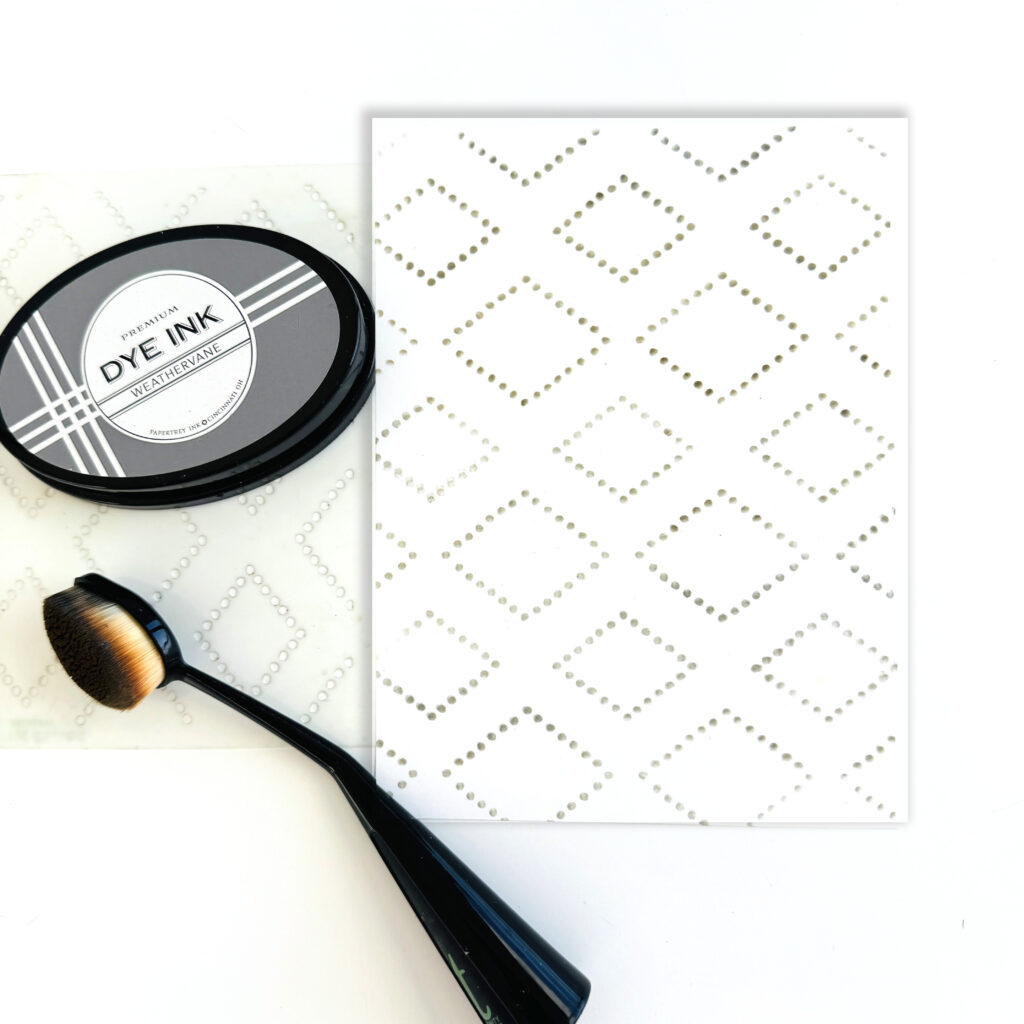 STEP 2: Cut a 5″ X 7″ card front panel from Stamper’s Select White cardstock. Stencil the diamond design using the Dotted Diamonds Stencil Collection and Weathervane Ink. Position the stencil in a landscape orientation to stencil the entire front, from the left to the right edges. Shift the stencil down to complete the lower half.