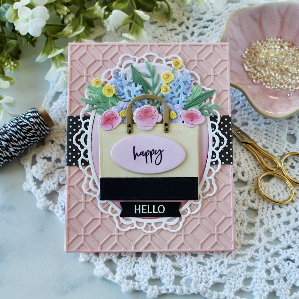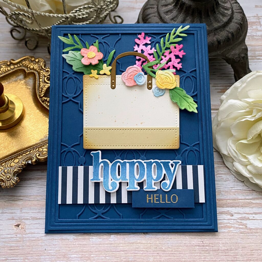 DIES: Into the Blooms: Bag of Blossoms, Cover Plate: Ornate, Border Bling: Skinny Embossed Frame, This is Big Sentiments: Happy Everything