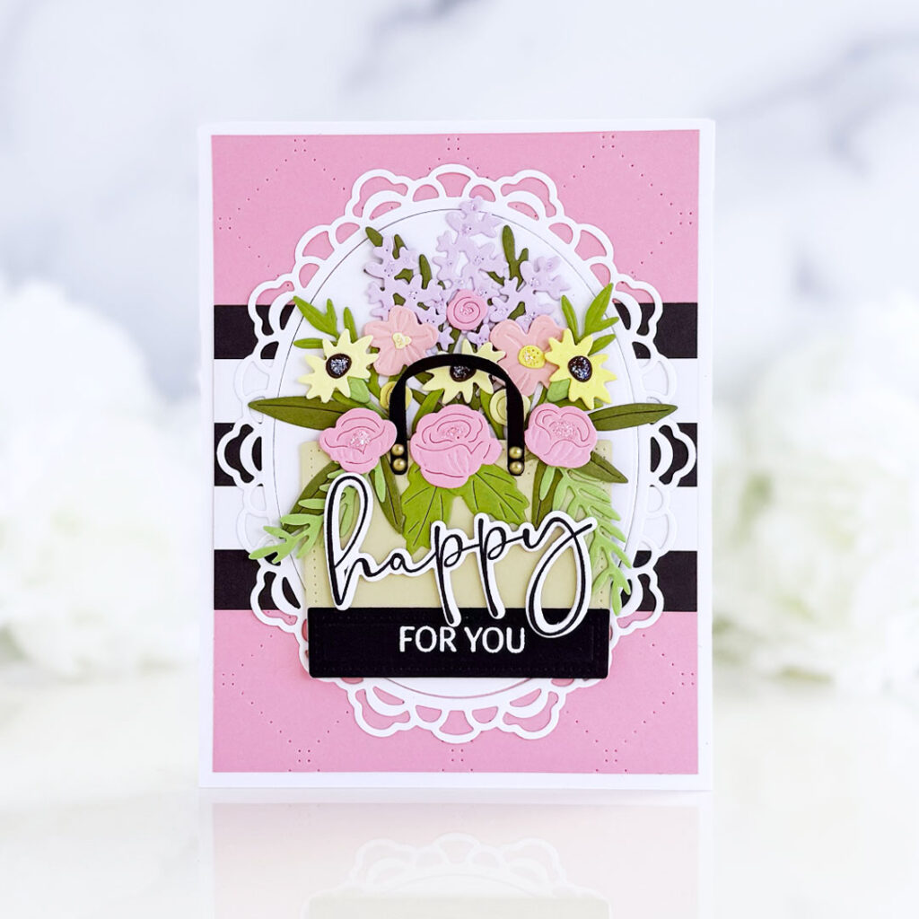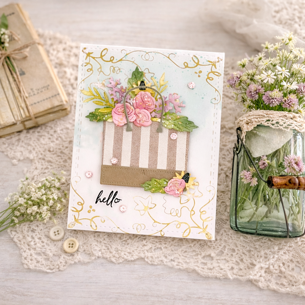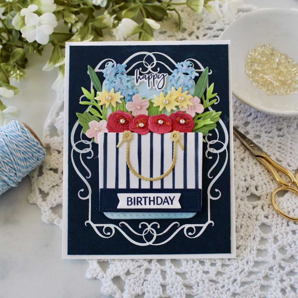 Create a charming gift bag overflowing with blooms using this beautifully detailed die collection. Layer blossoms, tuck in leafy accents, and arrange each element to design a full, dimensional bouquet that feels artfully composed.