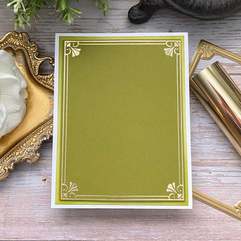 STEP 1: Adhere a 4 x 5 1/4” panel of Spring Moss card stock (add Simply Chartreuse ink around edges prior) onto a top folding white card base. Hot foil a Ripe Avocado panel and trim down. Add it to the card base using foam squares.