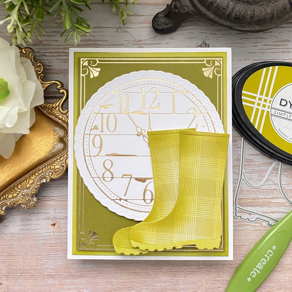 Kelly shares, “Celebrate the passing of time and for warmer days ahead with this burst of springtime greenery! I chose my sentiment carefully to reinforce the clock imagery with additional seasonal touches like clover, flowers, and rain boots! This card would be perfect for St. Patrick’s Day or to welcome in the upcoming season!”