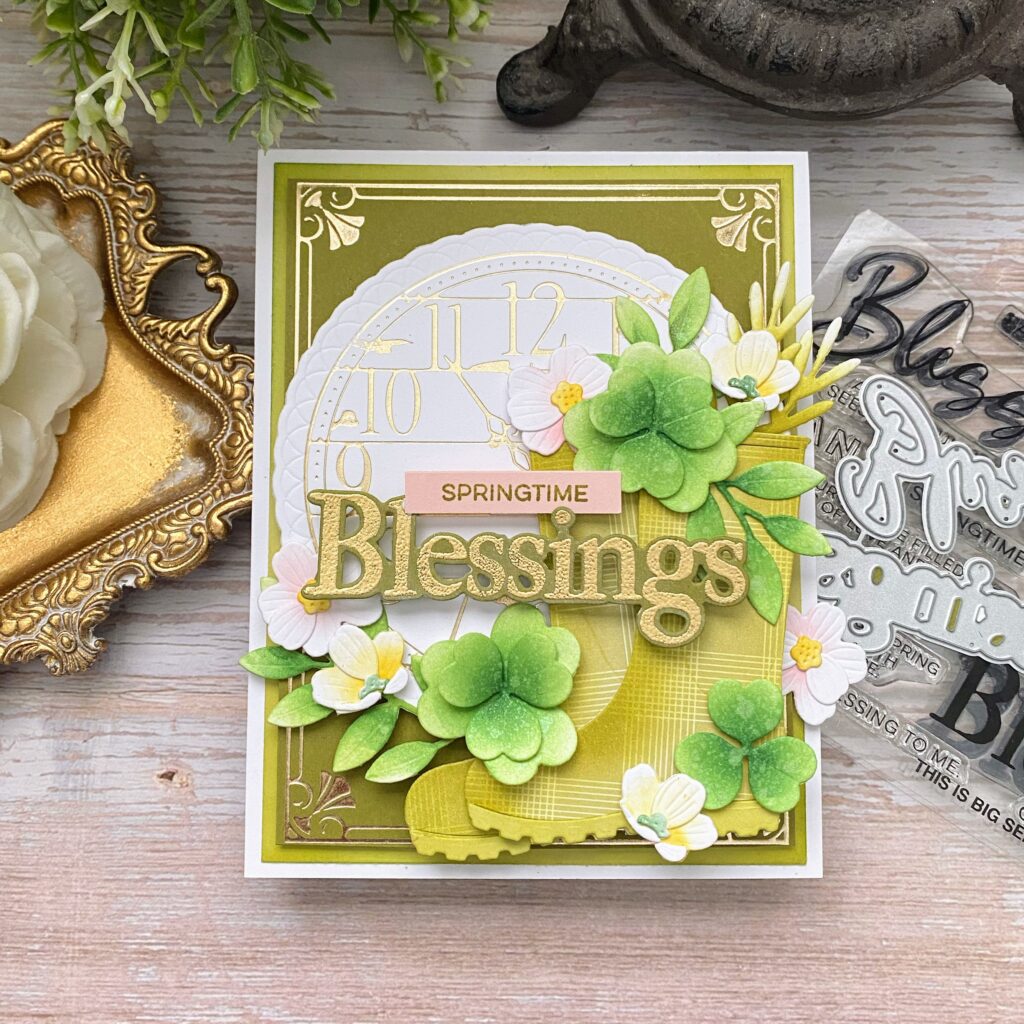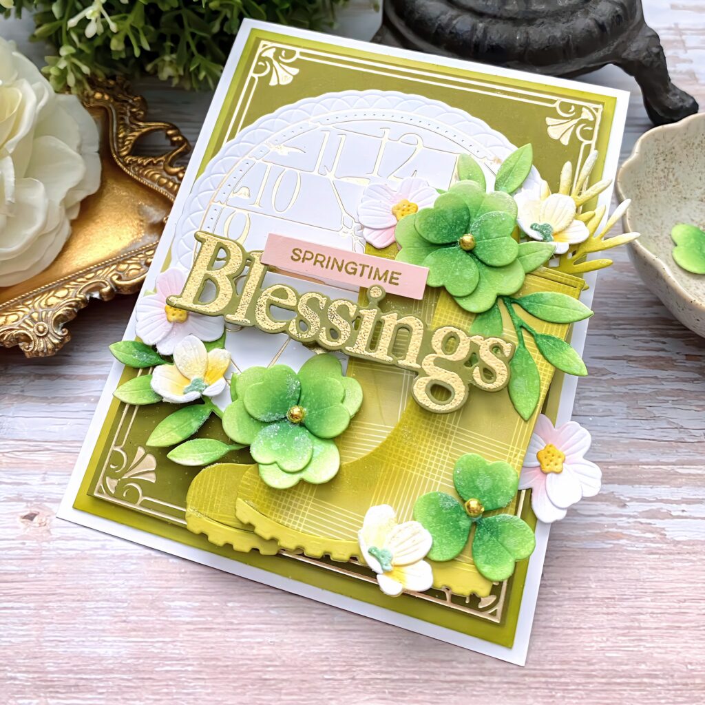 Kelly Lunceford welcomes the changing season with her Springtime Blessings card, a fresh and uplifting design that beautifully celebrates warmer days ahead. 🌿✨ By pairing the elegant Clock Hot Foil Plate with layered clover, florals, and dimensional rain boots, Kelly creates a card that feels both meaningful and full of movement. The champagne foiled details, gold embossed sentiment, and touches of shimmer add richness and warmth, while the vibrant greens bring the promise of spring to life.