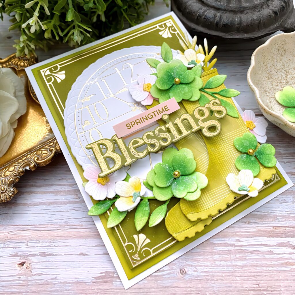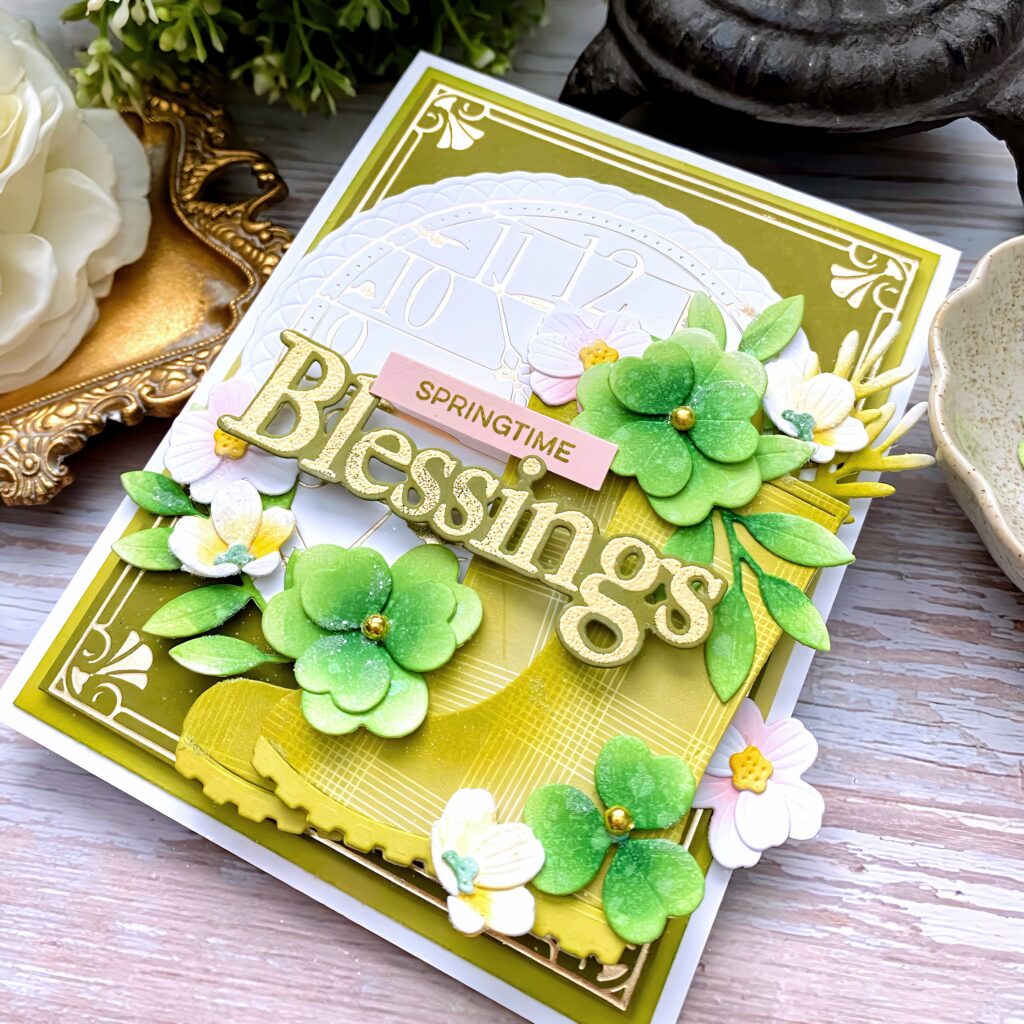 This project is a beautiful reminder that seasonal elements and thoughtful symbolism can come together to create something truly special. ✨ From the foiled clock background to the layered greenery and golden accents, every detail reinforces the theme of renewal and blessing. Whether you’re crafting for St. Patrick’s Day or simply celebrating the arrival of spring, let this design inspire you to combine meaningful imagery with bold sentiments.
