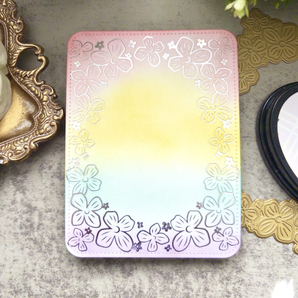 STEP 1: Foil a panel of white cardstock using the Framed in Flowers Hot Foil Plate. Trim the panel using the Rounded Rectangles: Pierced Die. Add color around the foiled design using ink and blender brushed.